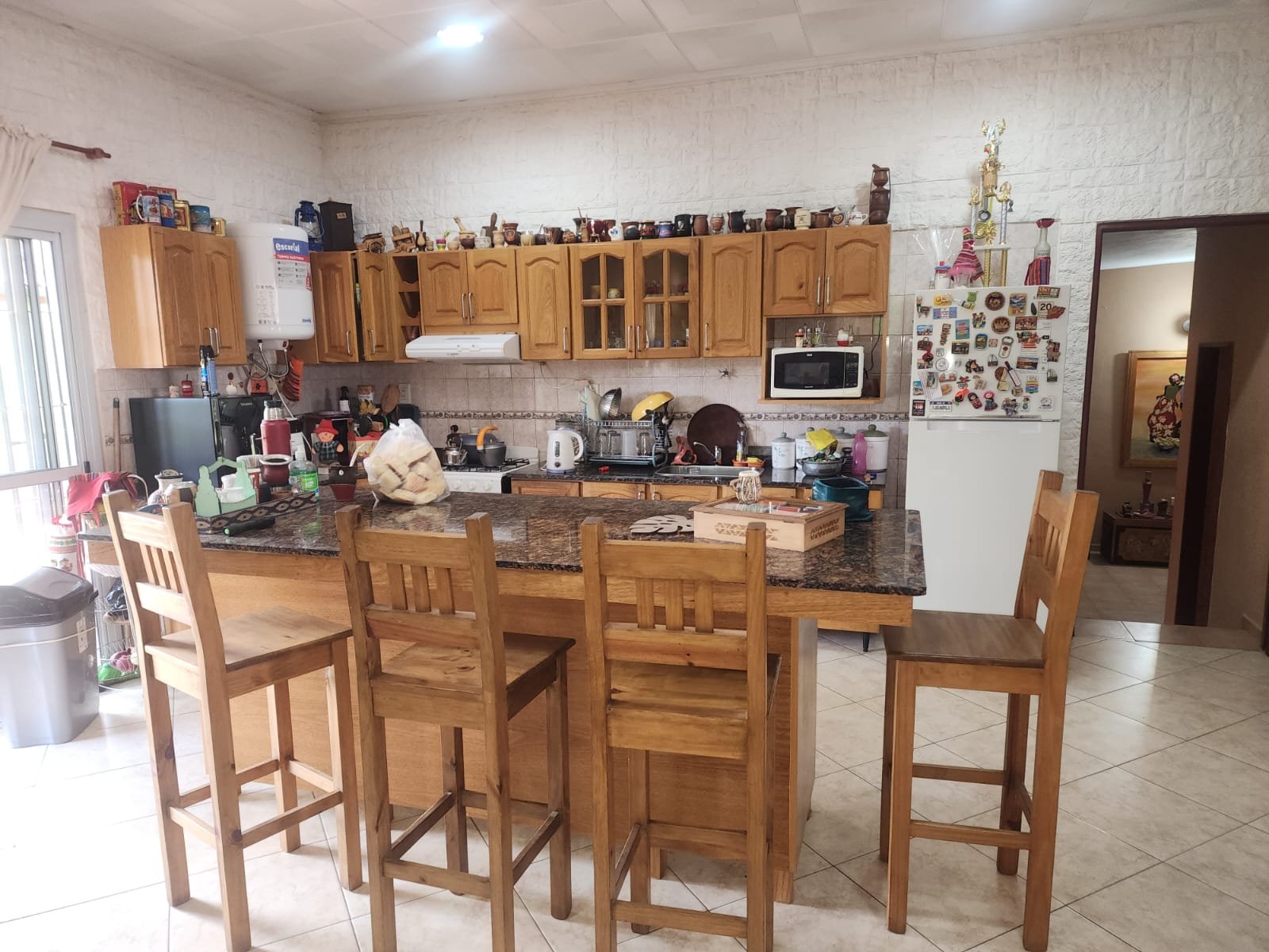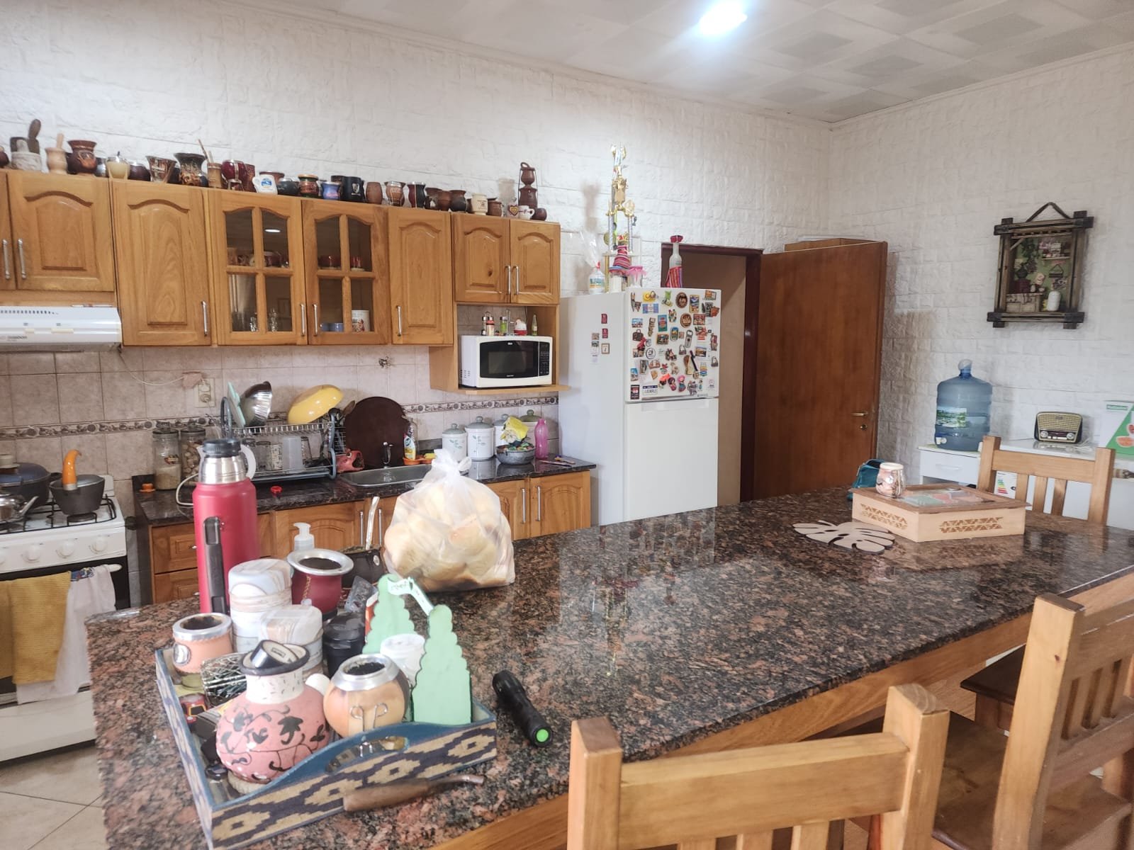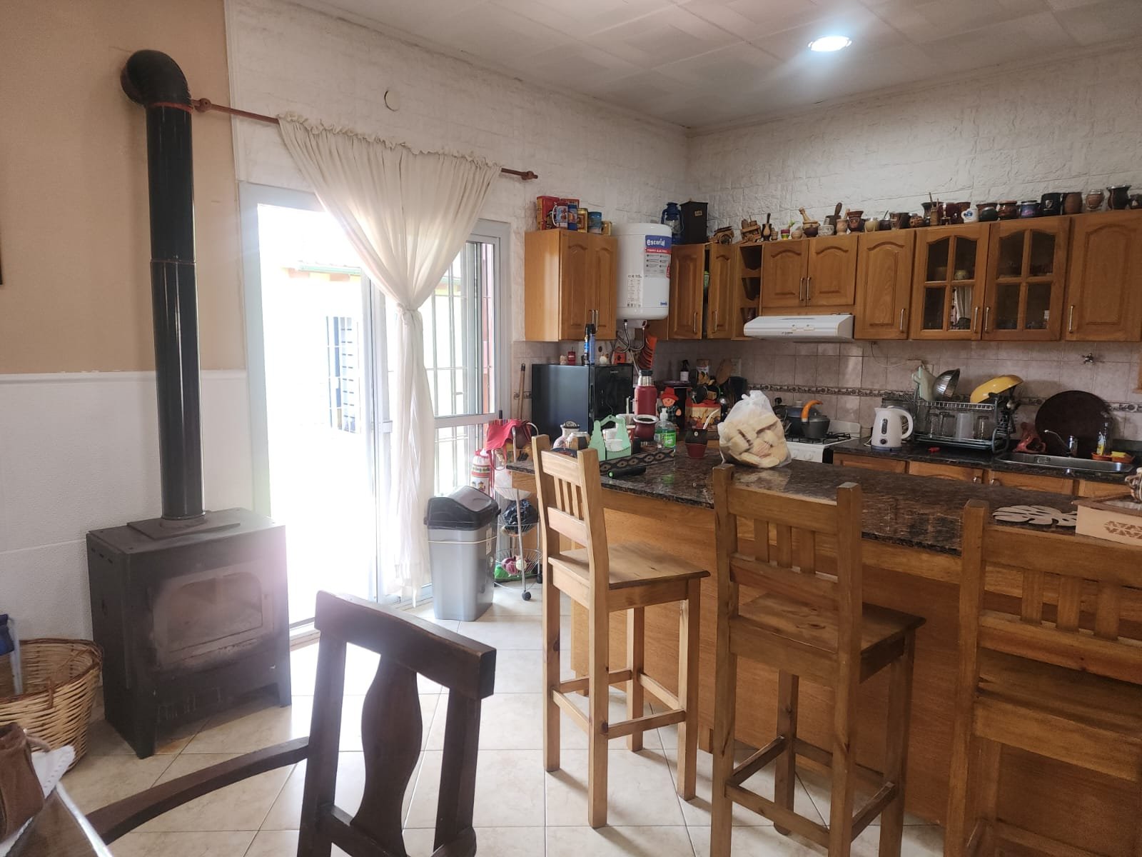 1 Cocina living comedor integrada de gran tamaño, muy luminosa con buena ventilación, estufa tipo tromen a leña para calefaccionarse y aire acondicionado. La cocina se encuentra separada del comedor por una isla construida con base de madera y mesada de mármol granito. La misma se compone de alacena y bajomesada de madera, mesada de mármol granito con bacha de acero inoxidable, extractor de humo y calefón.
