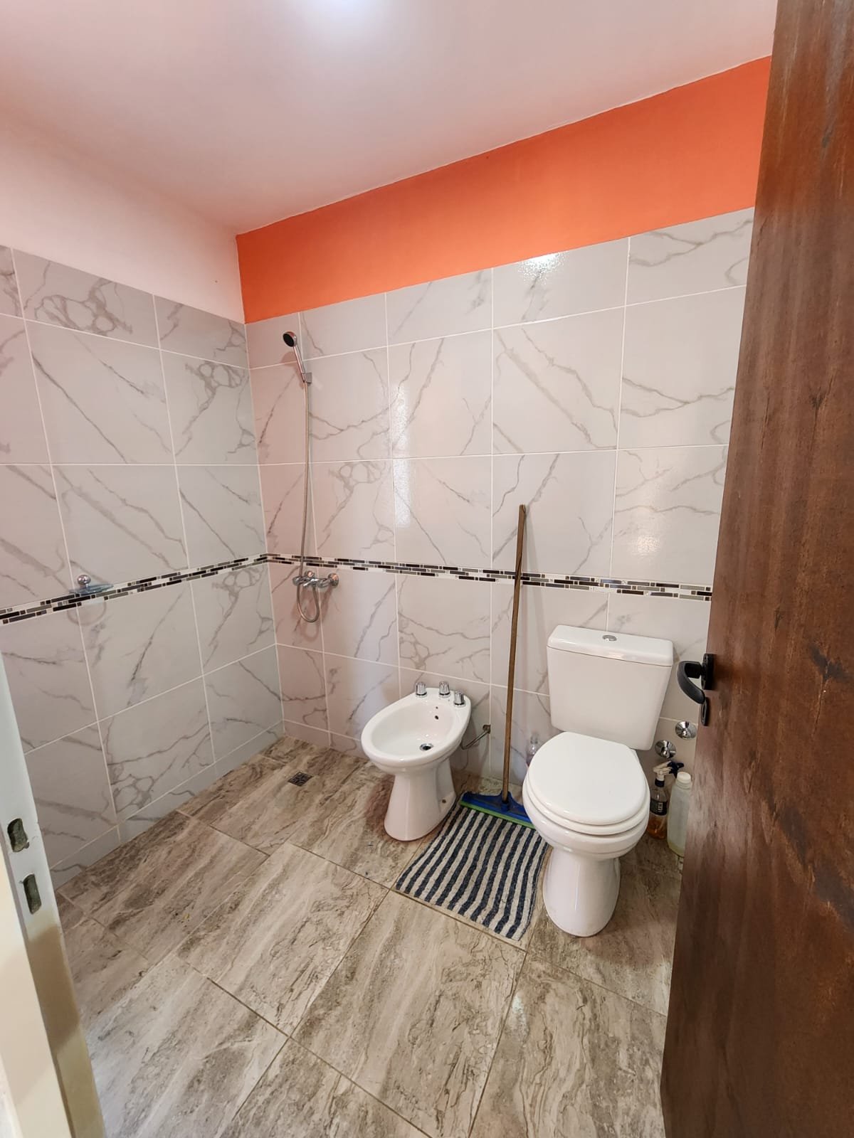 1 Ante baño más Baño completo con todos sus accesorios. El Ante baño tiene espejo, vanitory con pileta para lavarse las manos de cerámica, base y estantes de madera. Baño con inodoro, bidet, ducha y la pared revestida con cerámicos.