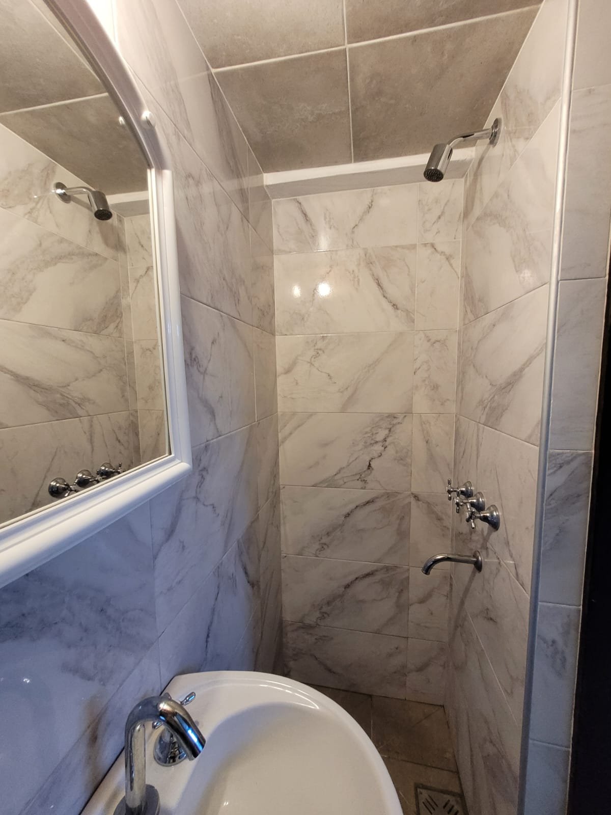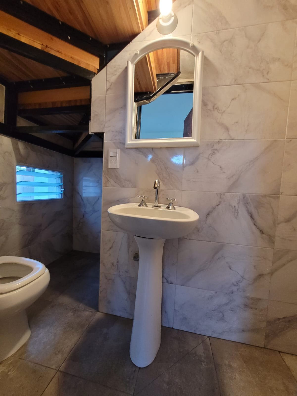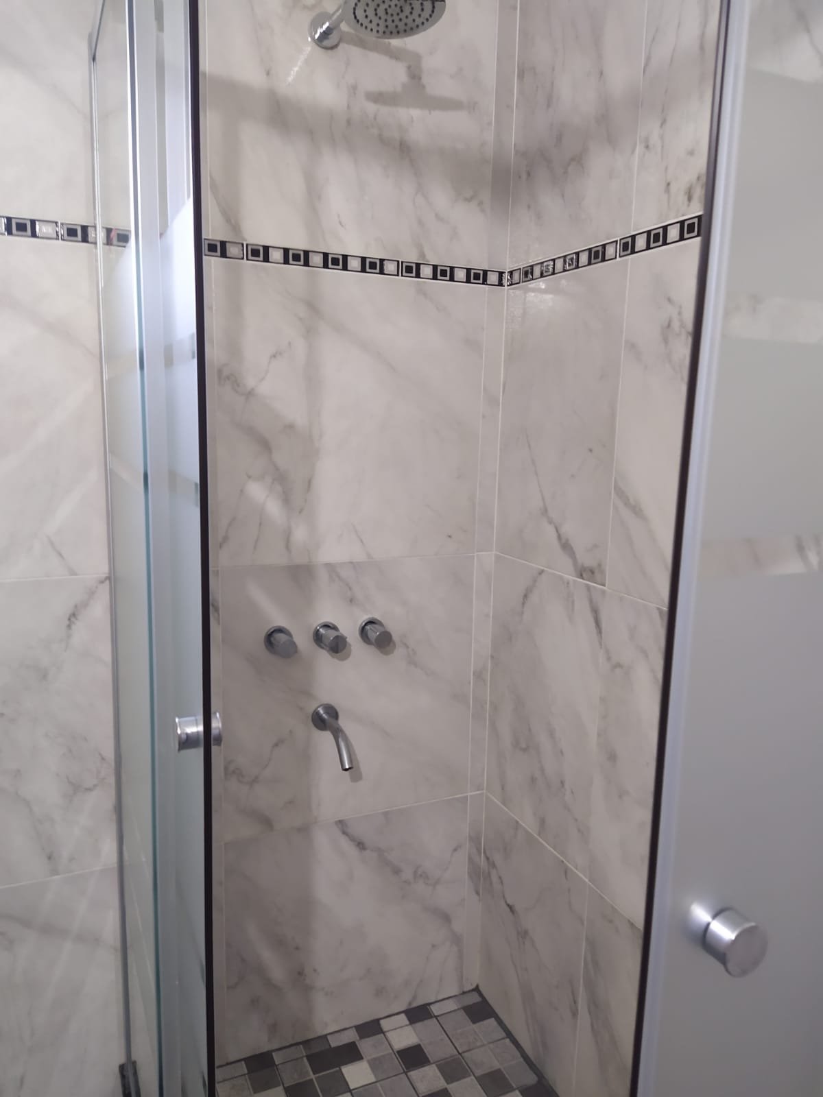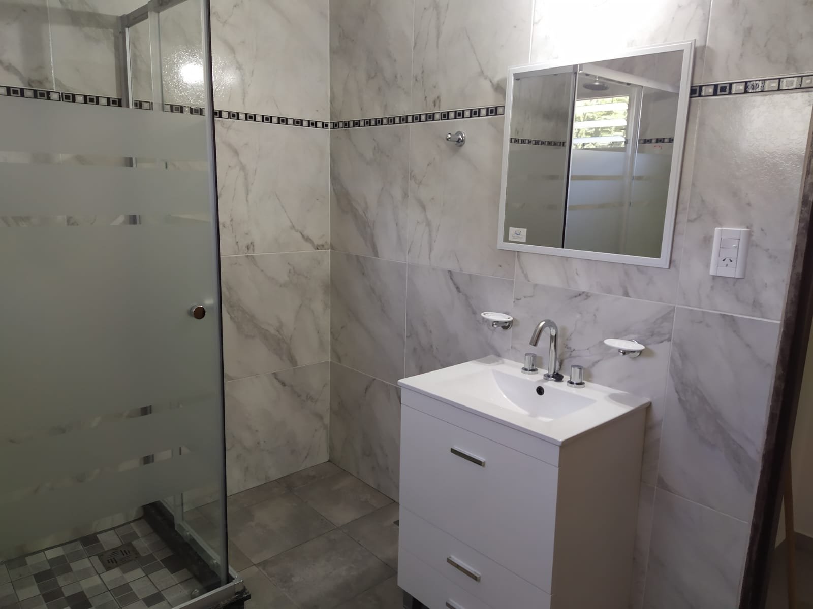1 Baño de estilo moderno completo con todos sus accesorios mas vanitory, espejo, cabina para la ducha vidriada y la pared revestida con cerámicos de piso a techo con detalle de guarda.