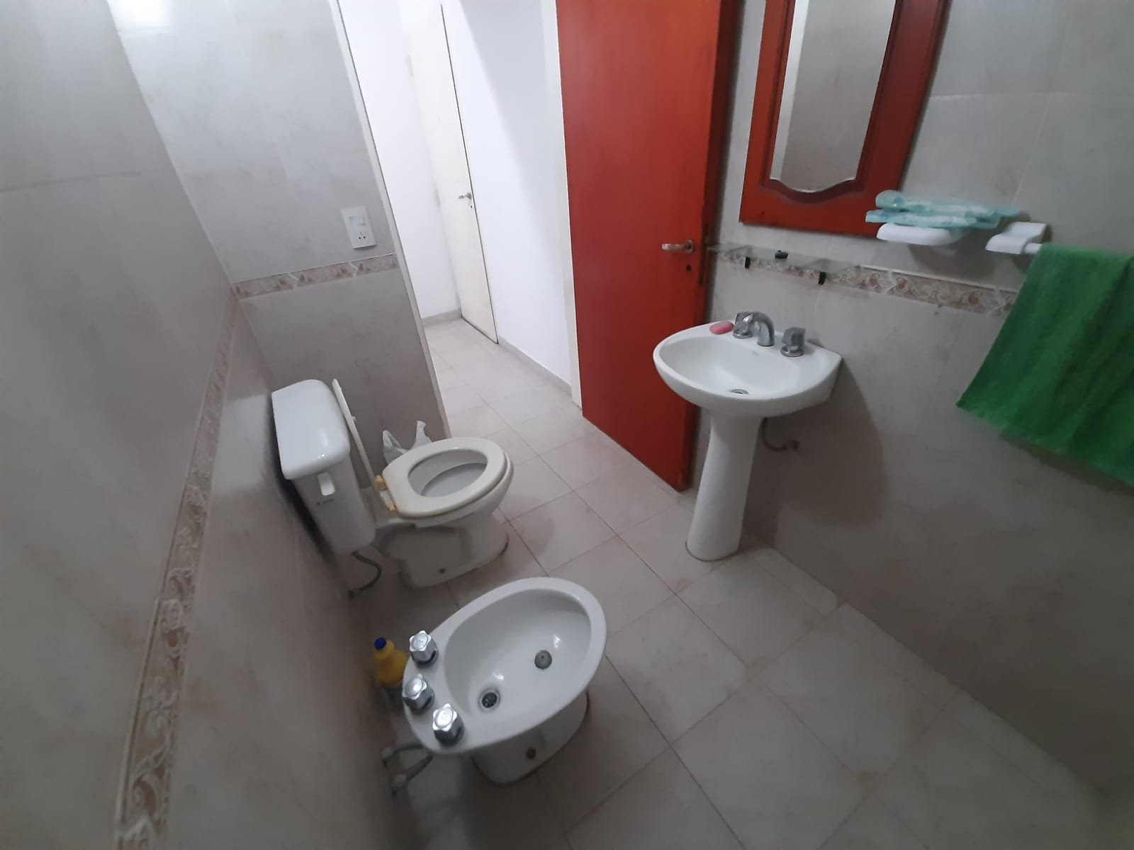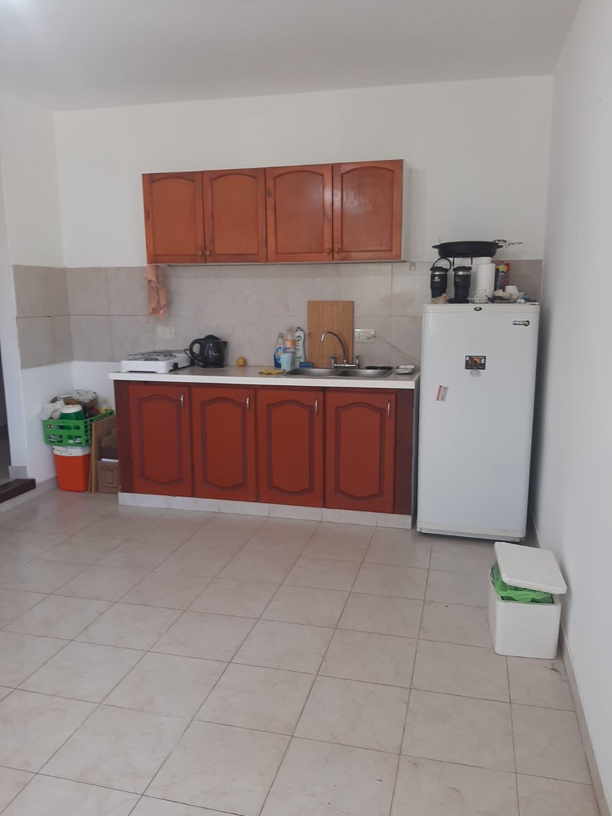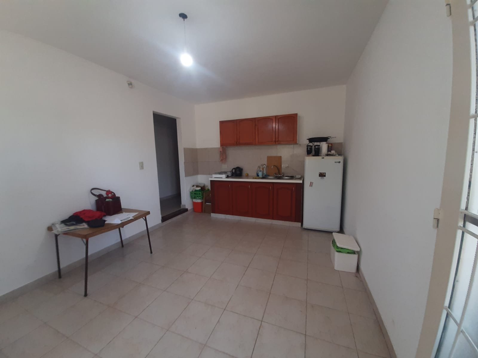 1 Cocina comedor amplia con acceso desde el pasillo divisorio y salida al patio trasero. La cocina se compone de alacena y bajomesada de madera, mesada con doble bacha de acero inoxidable y la pared revestida con cerámicos.