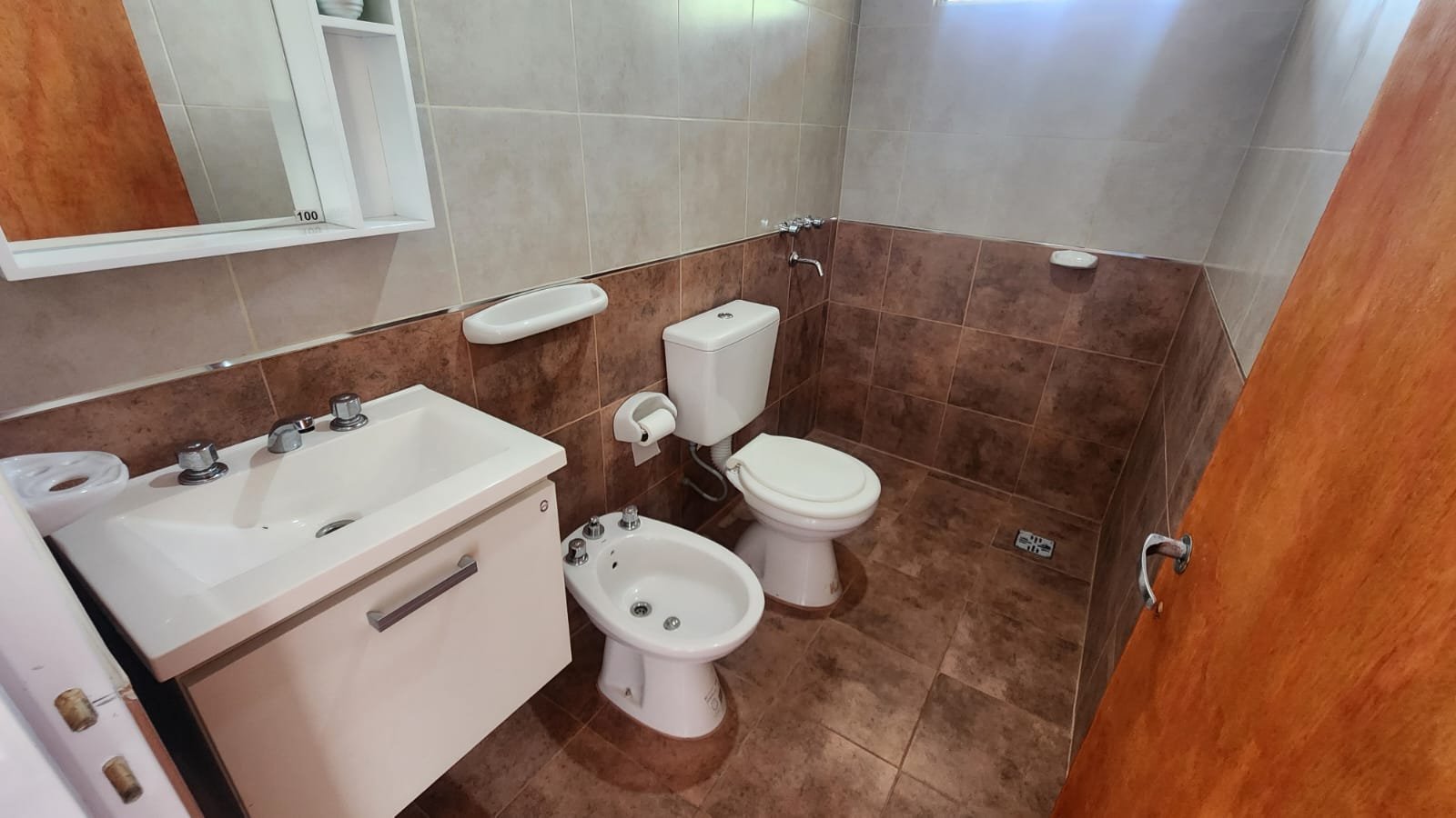 1 Baño completo con todos sus accesorios más vanitory y la pared revestida con cerámicos.