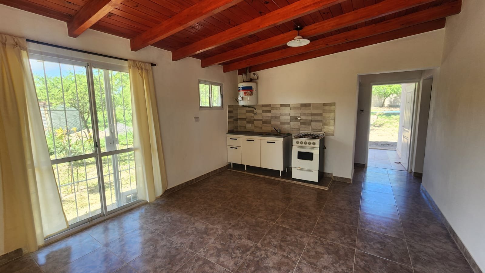 1 Cocina comedor de gran tamaño con buena luminosidad, ventilación y salida a un costado del patio por medio de una puerta ventana de aluminio con rejas. La cocina se compone de bajomesada de melamina con mesada y bacha de acero inoxidable, termotanque a gas y la pared revestida con cerámicos.
