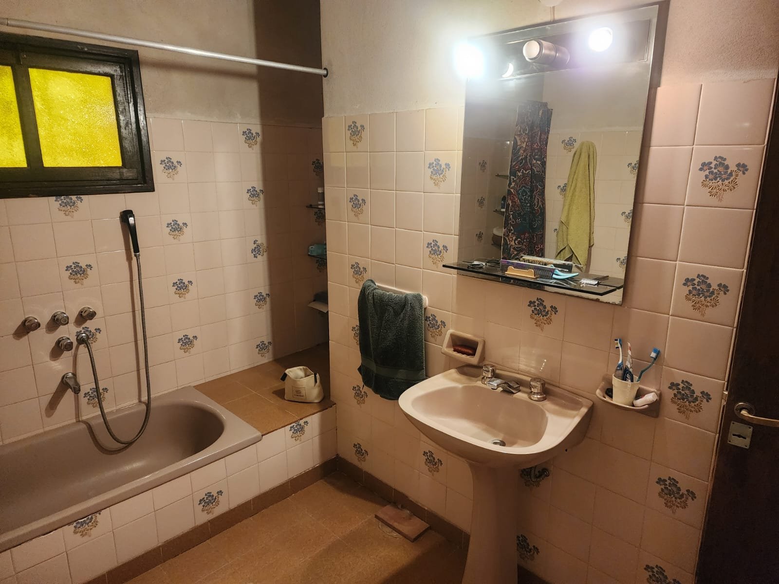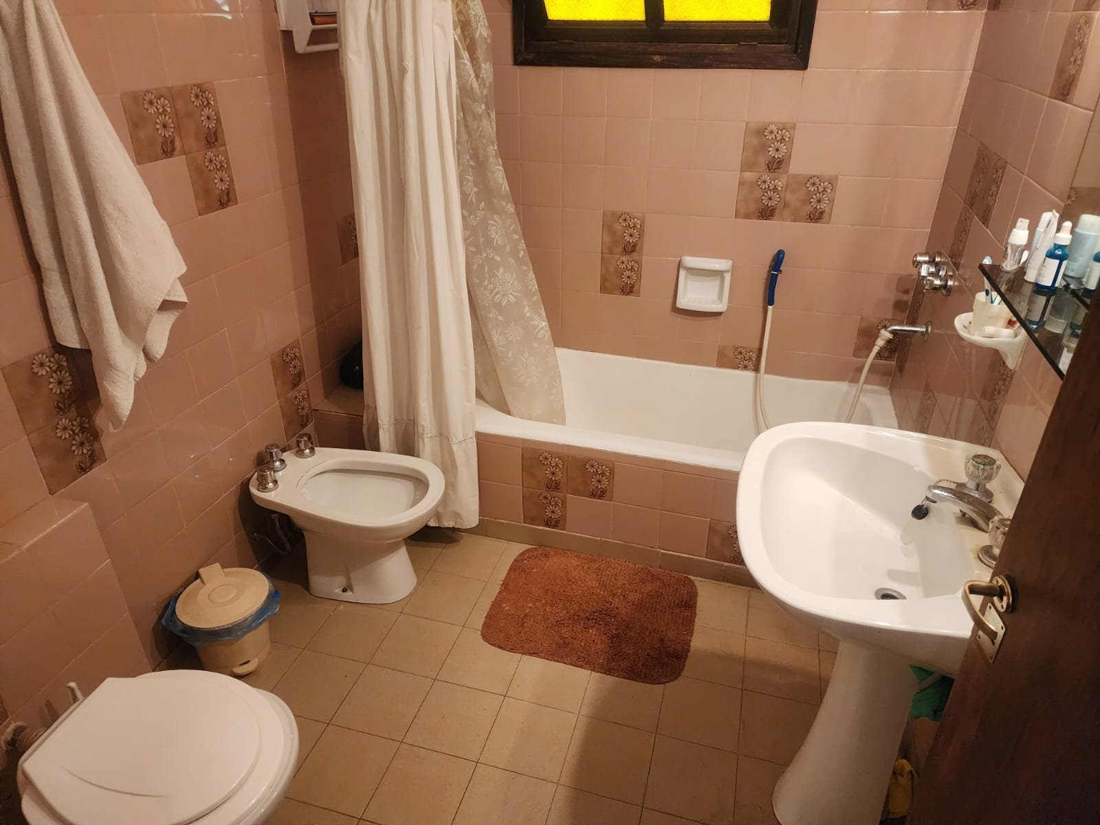 2 Baños completos con todos sus accesorios más bañera y la pared revestida con azulejos. Uno de los baños tiene a los extremos de la bañera empotrado muebles con lugar para guardado de toallas y demás accesorios.
