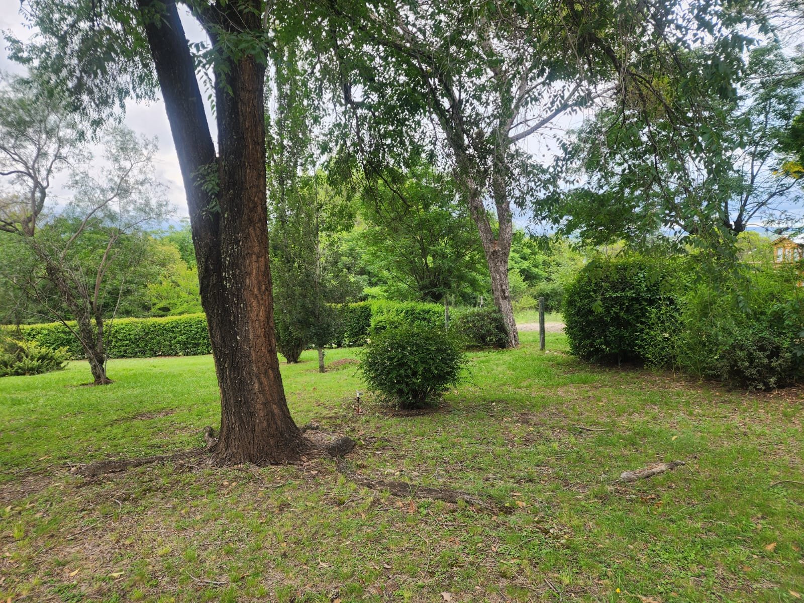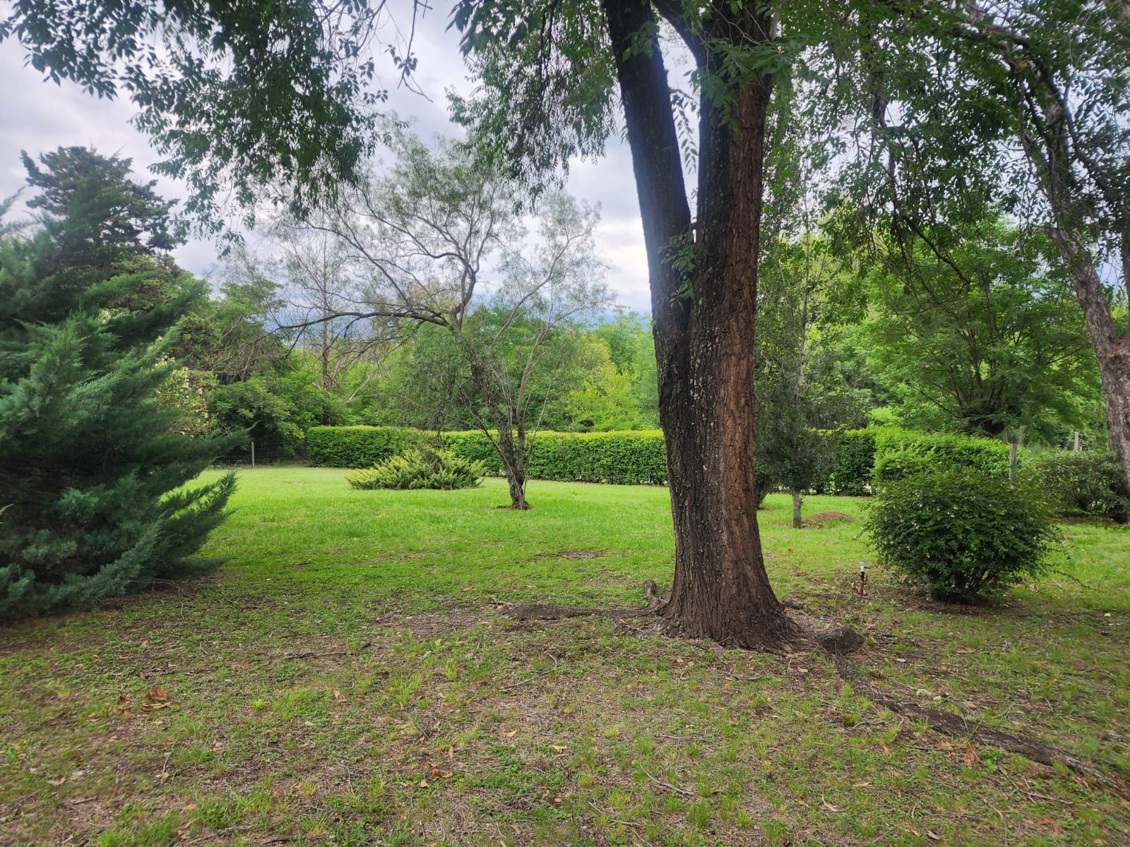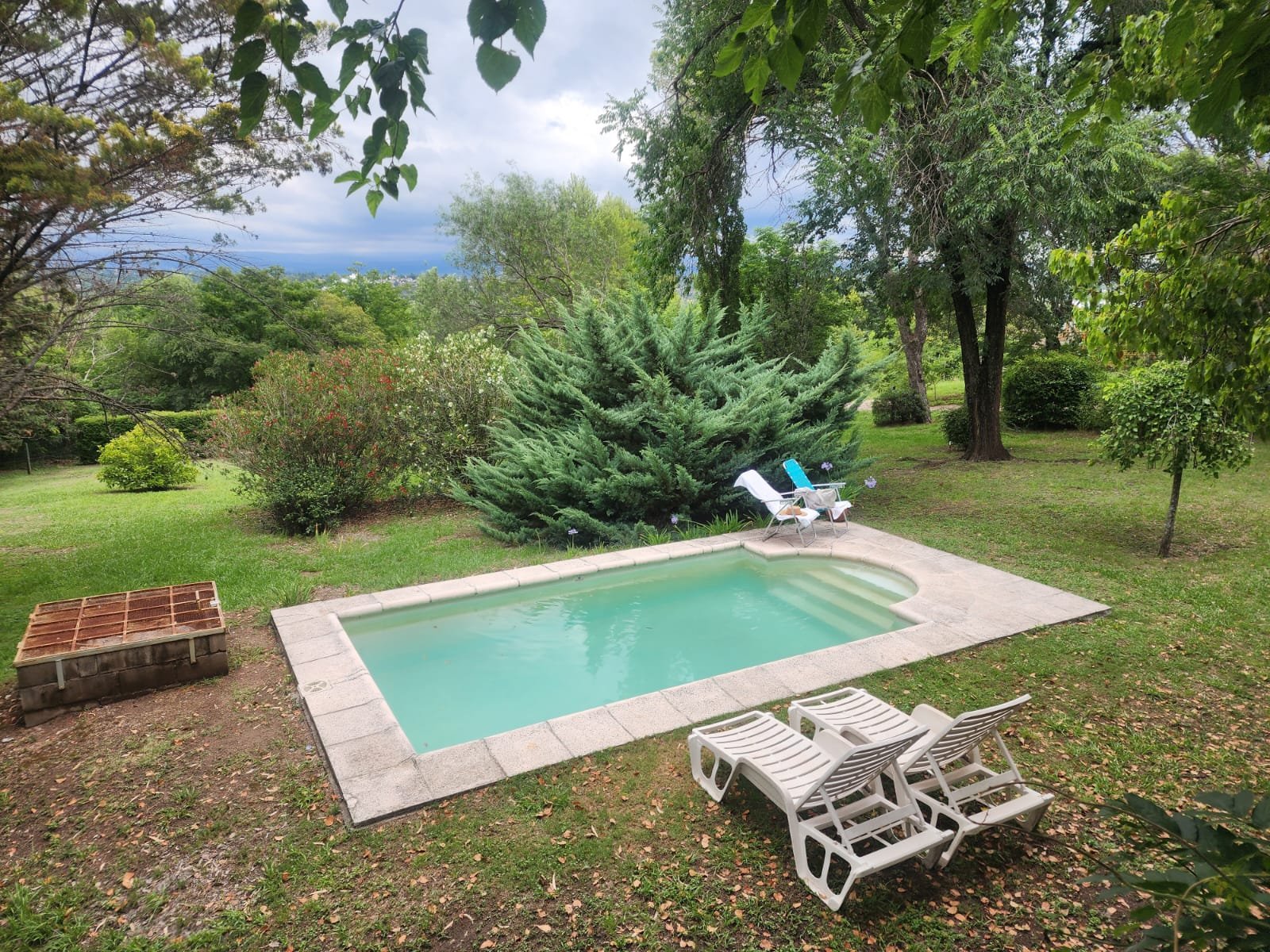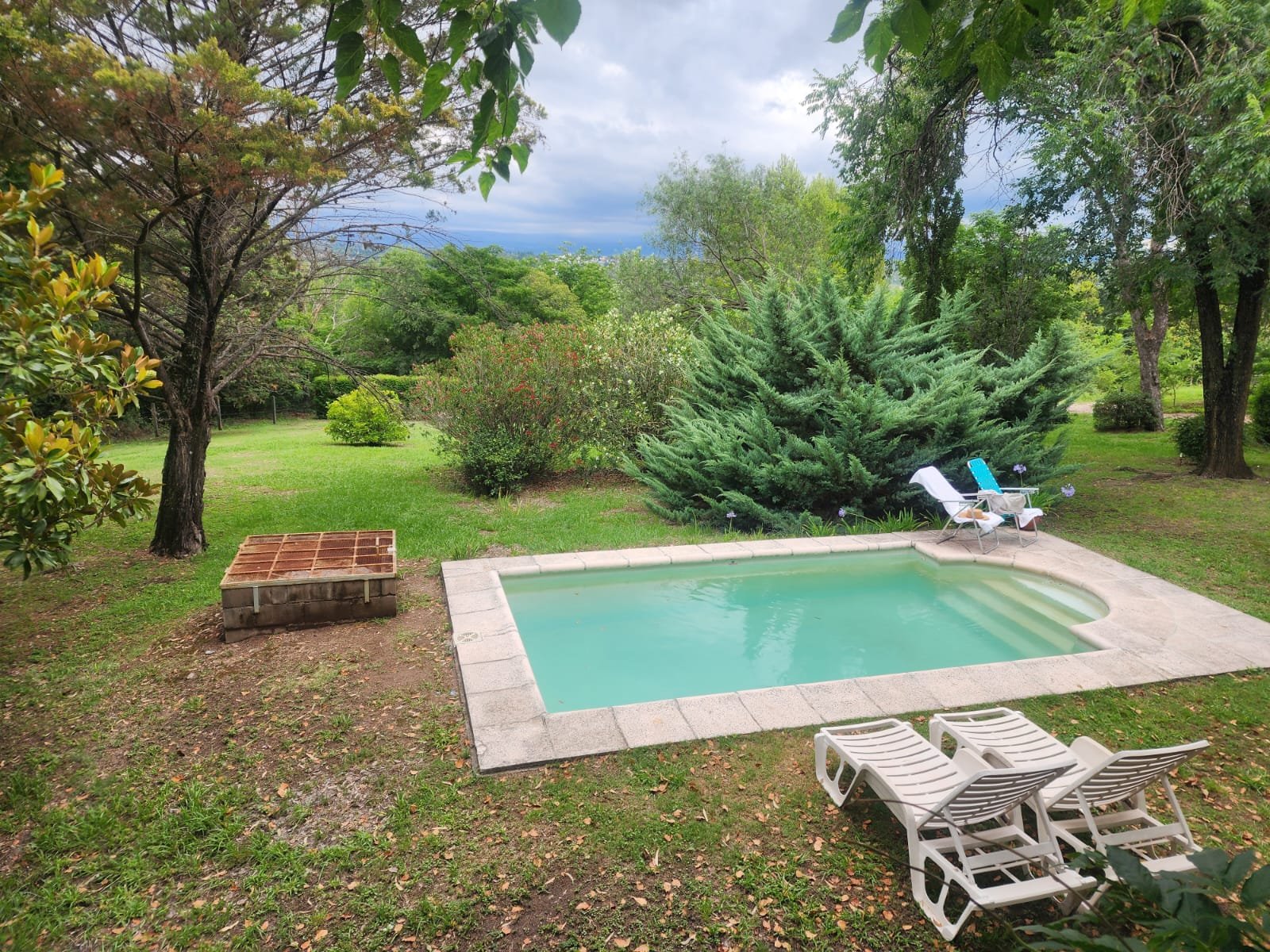 Por fuera se puede disfrutar de gran patio parquizado con mucho espacio libre para agregar otras construcciones. El parque tiene mucha variedad de árboles y plantas como mora, magnolia, pinos, laurel, aguaribay, dama de noche, glicina, etc.