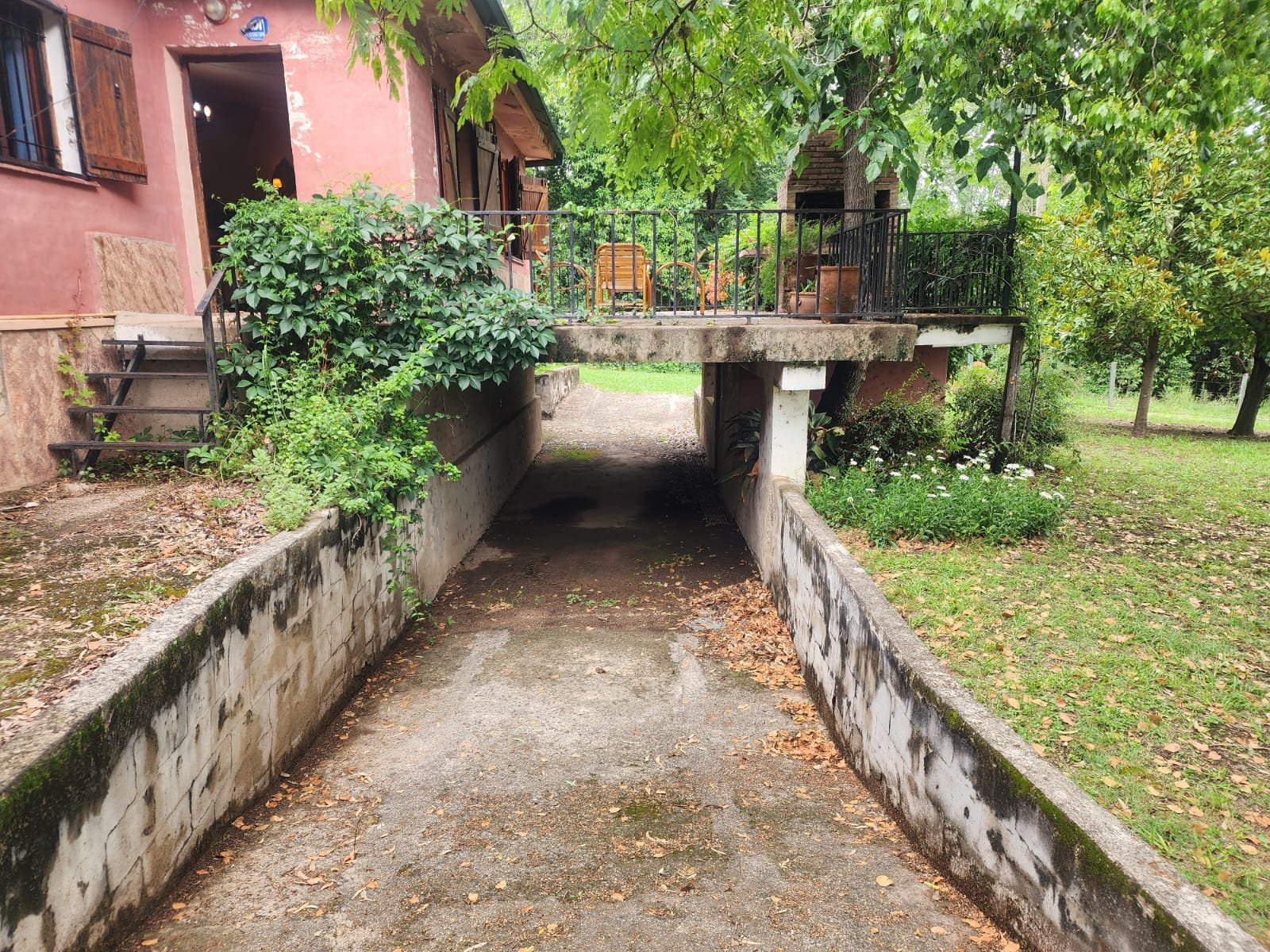 1 Cochera para guardar un vehículo situada debajo del balcón terraza, aprovechando el desnivel del terreno con acceso desde los dos lados con piso de material y techo de losa.