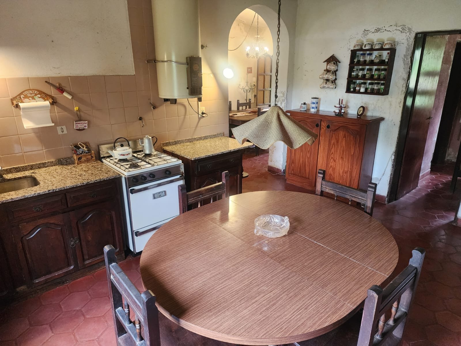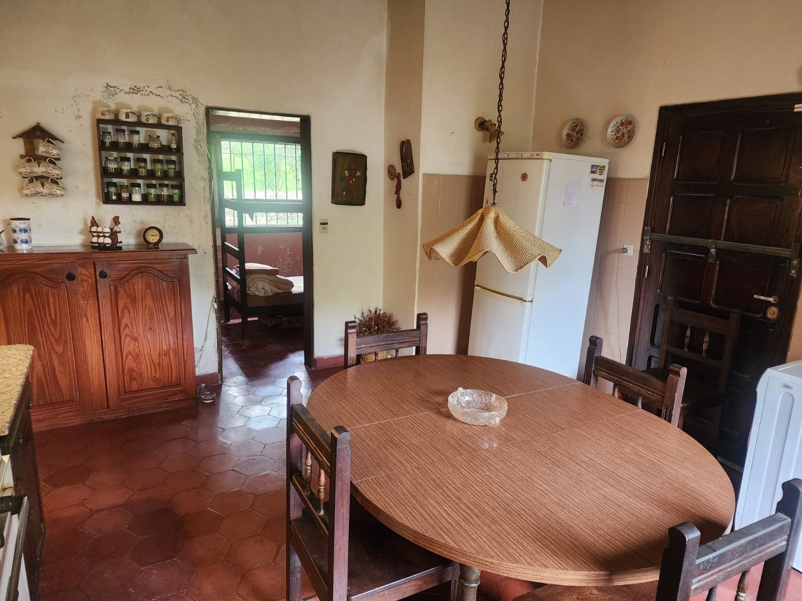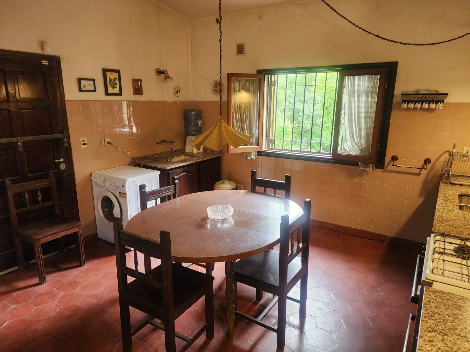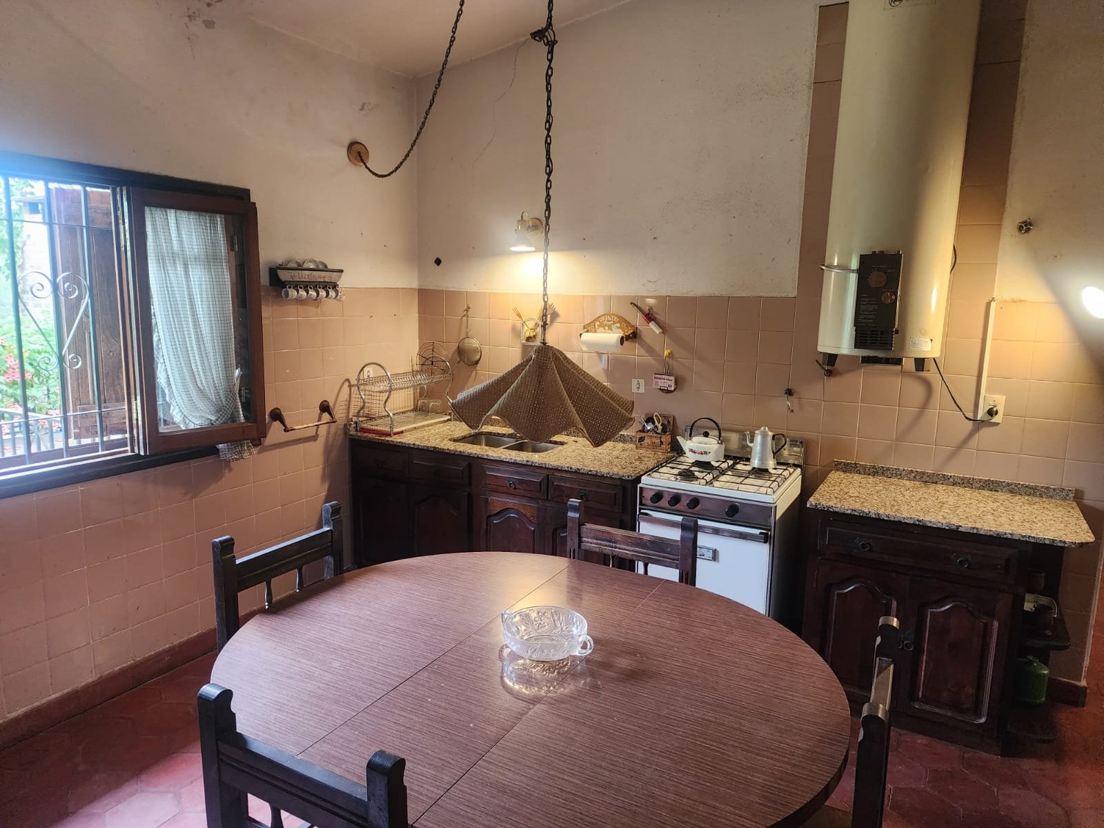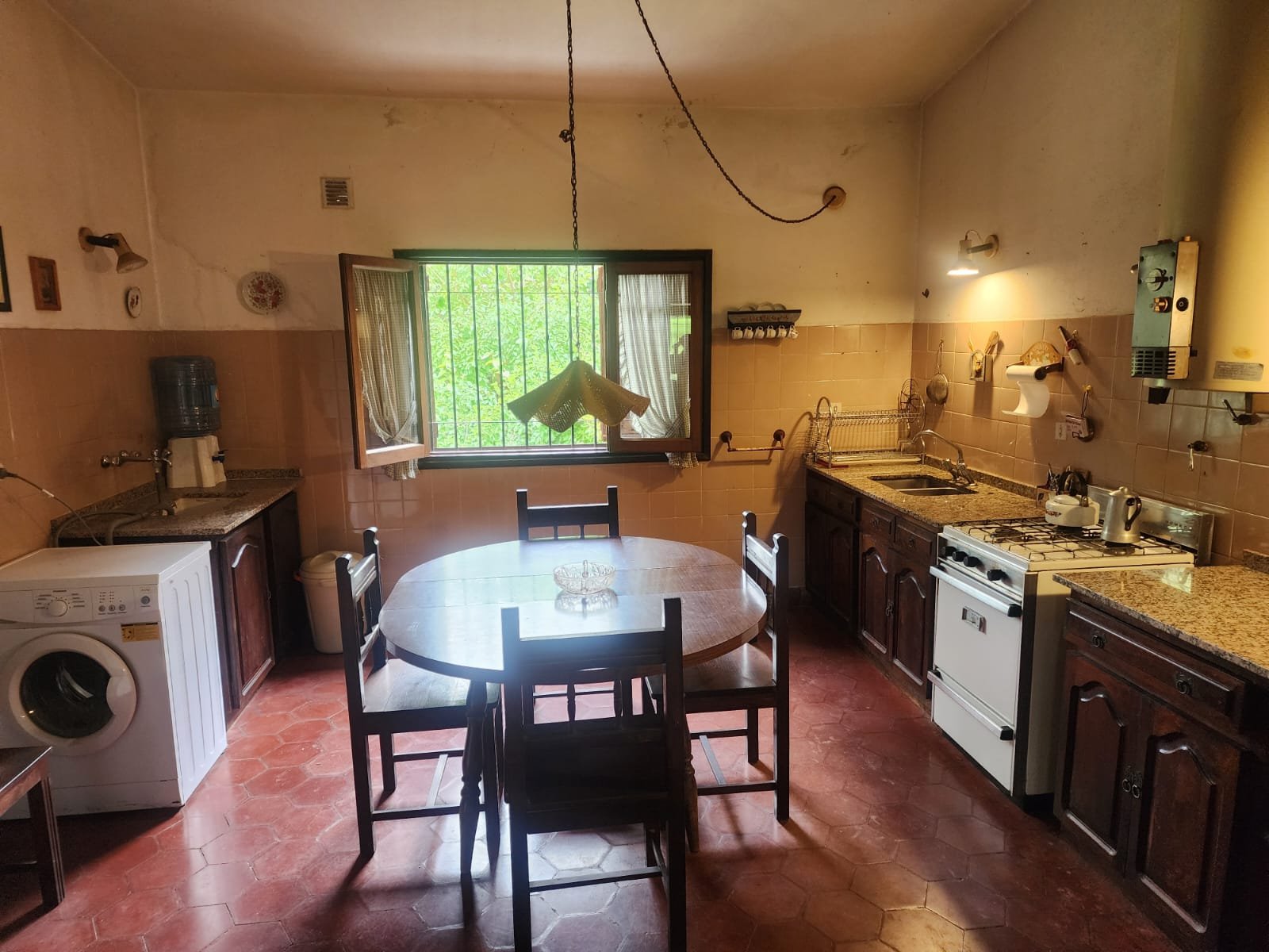 1 Cocina comedor con salida al patio. La misma se compone de bajomesada de madera, mesada de mármol granito con doble bacha de acero inoxidable, termotanque grande a gas, conexión para lavarropas automático y la pared revestida con azulejos. Hay una bomba presurizadora para ayudar a la presión y el agua caliente.