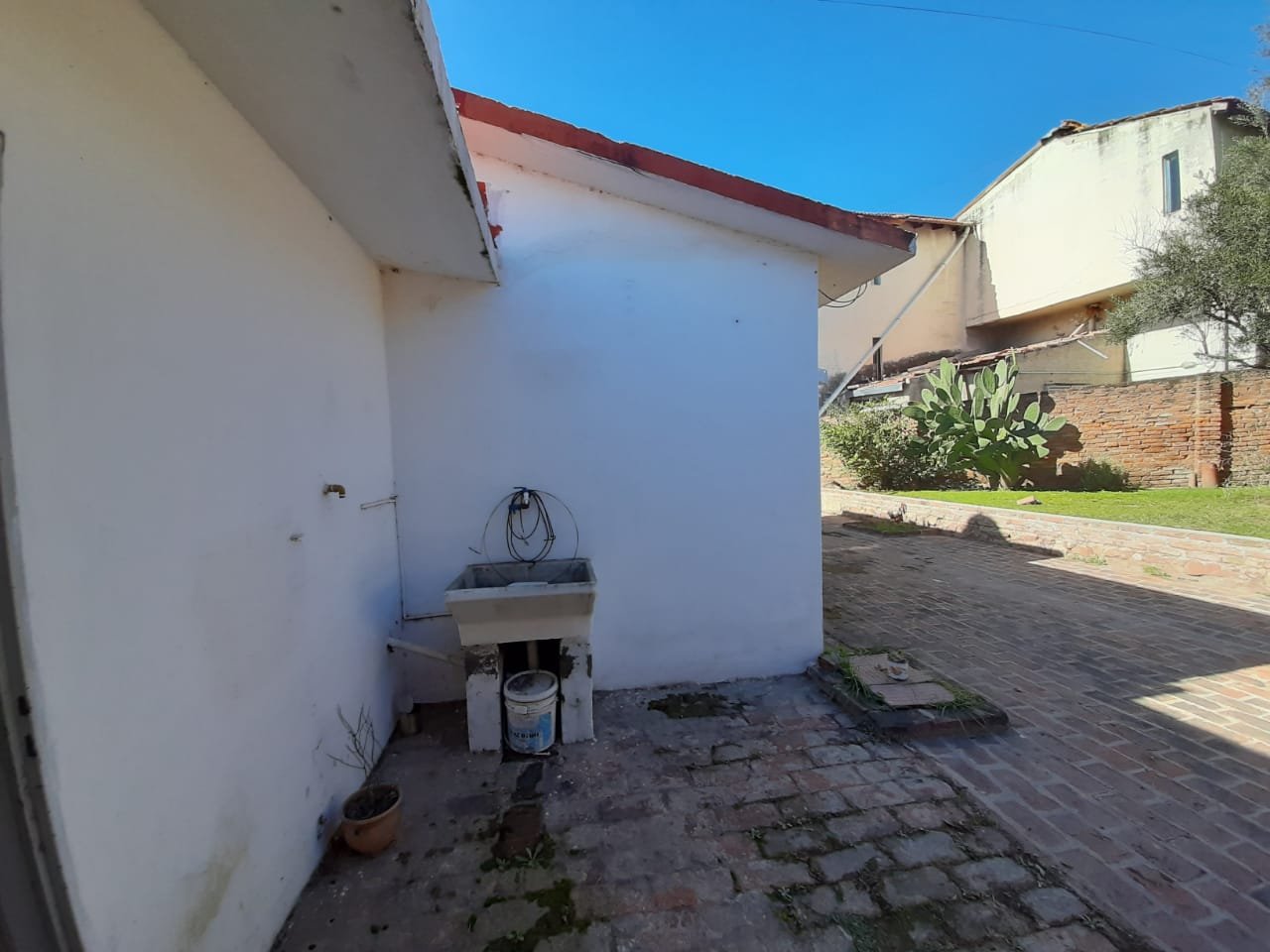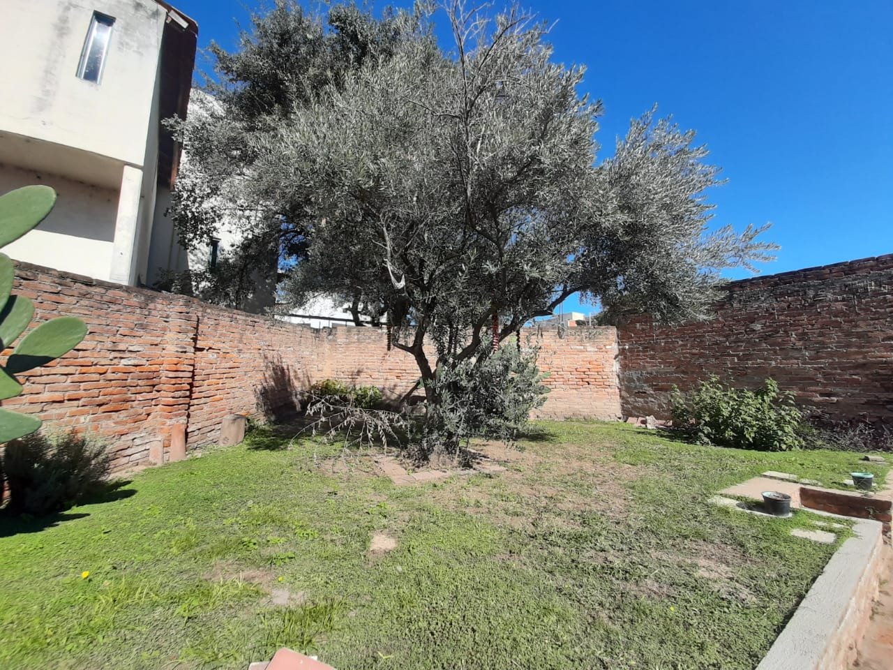 Patio en el fondo con pileta de lavar, una parte con piso de ladrillos y otra parte parquizado con plantas y árboles.