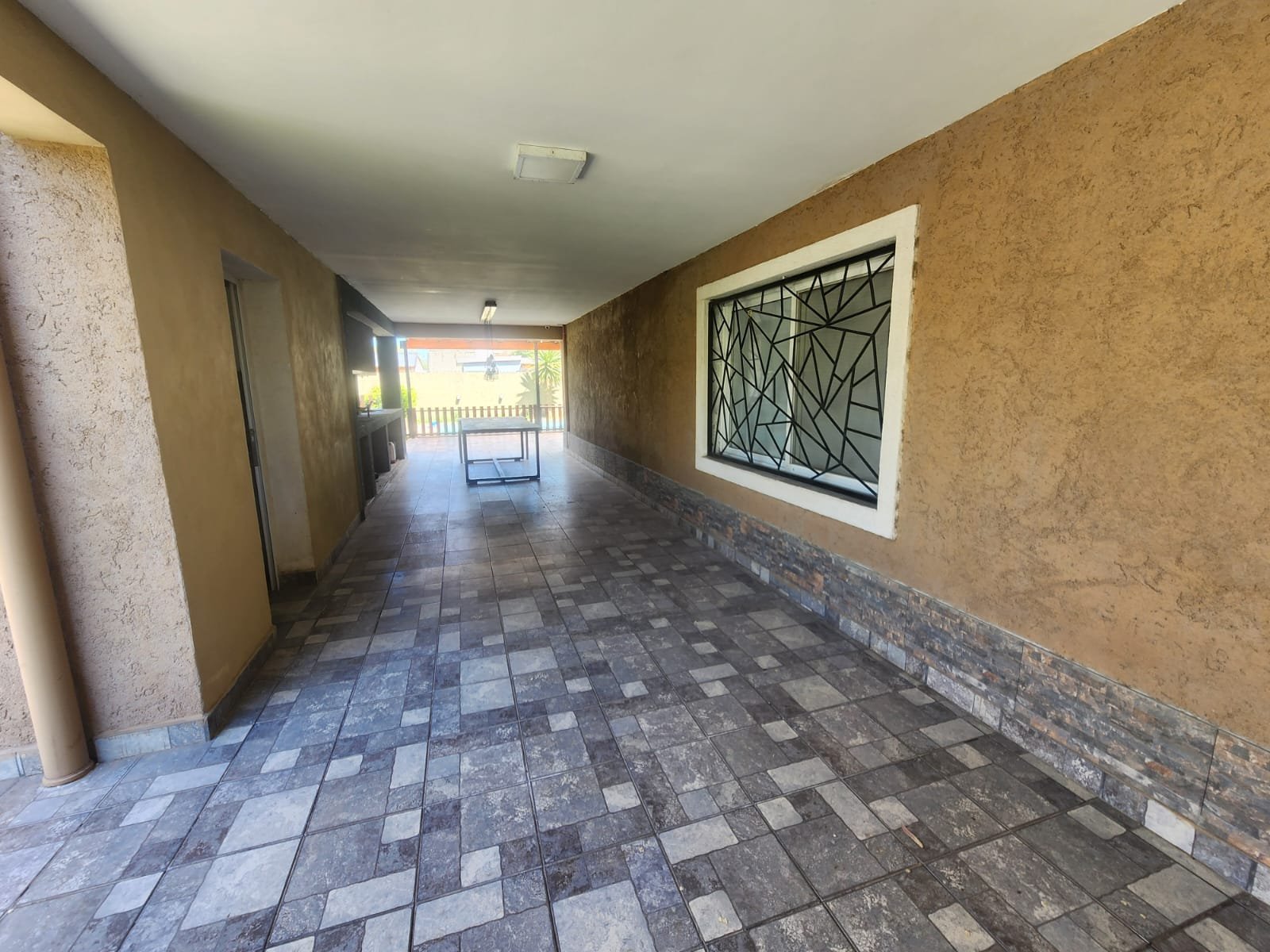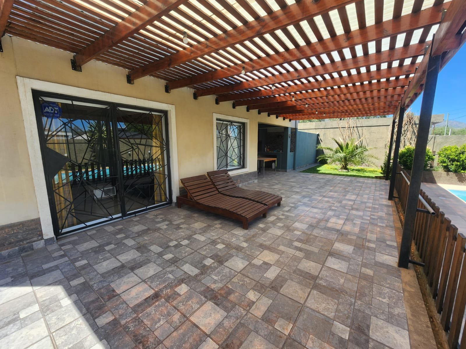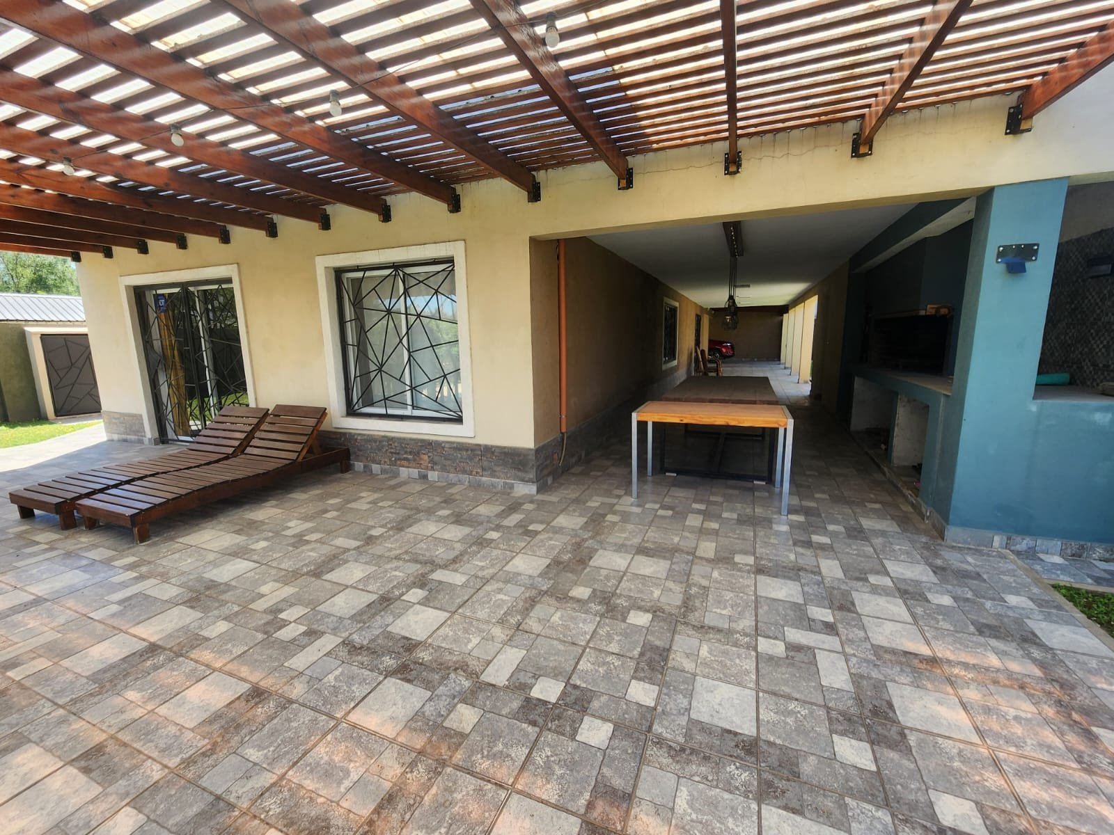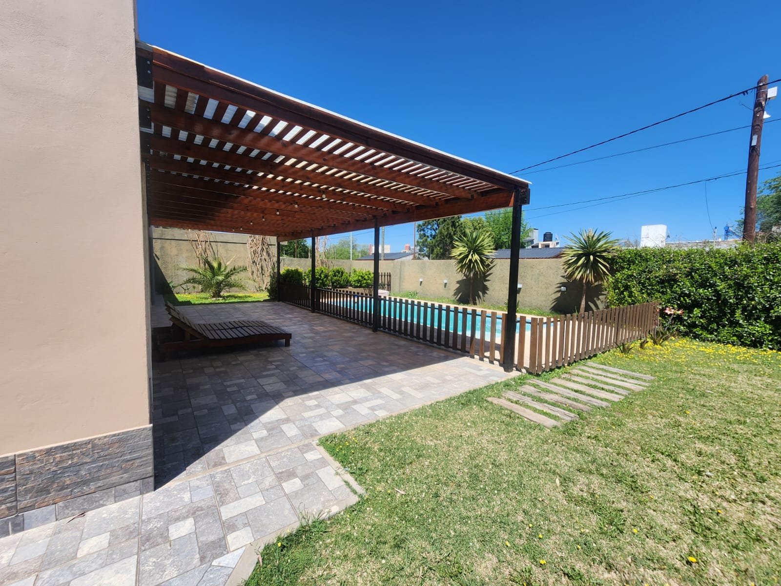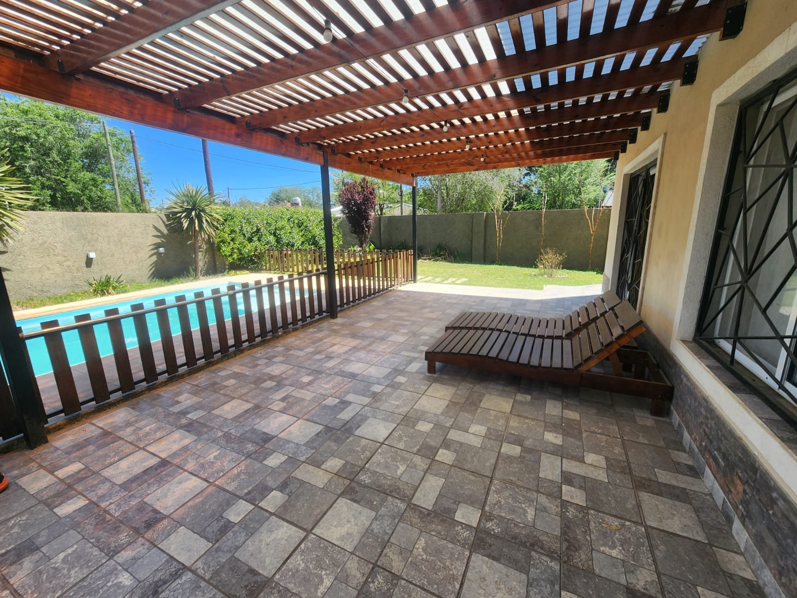 1 Galería semicubierta para disfrutar al costado de la pileta. La misma tiene techo tipo pérgola con estructura de madera, chapas transparentes para brindar mayor luminosidad y pisos cerámicos alto tránsito.