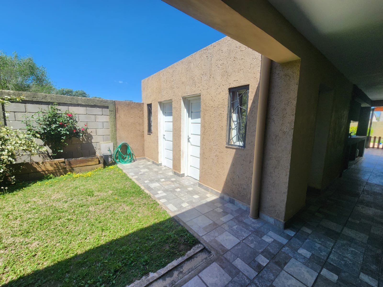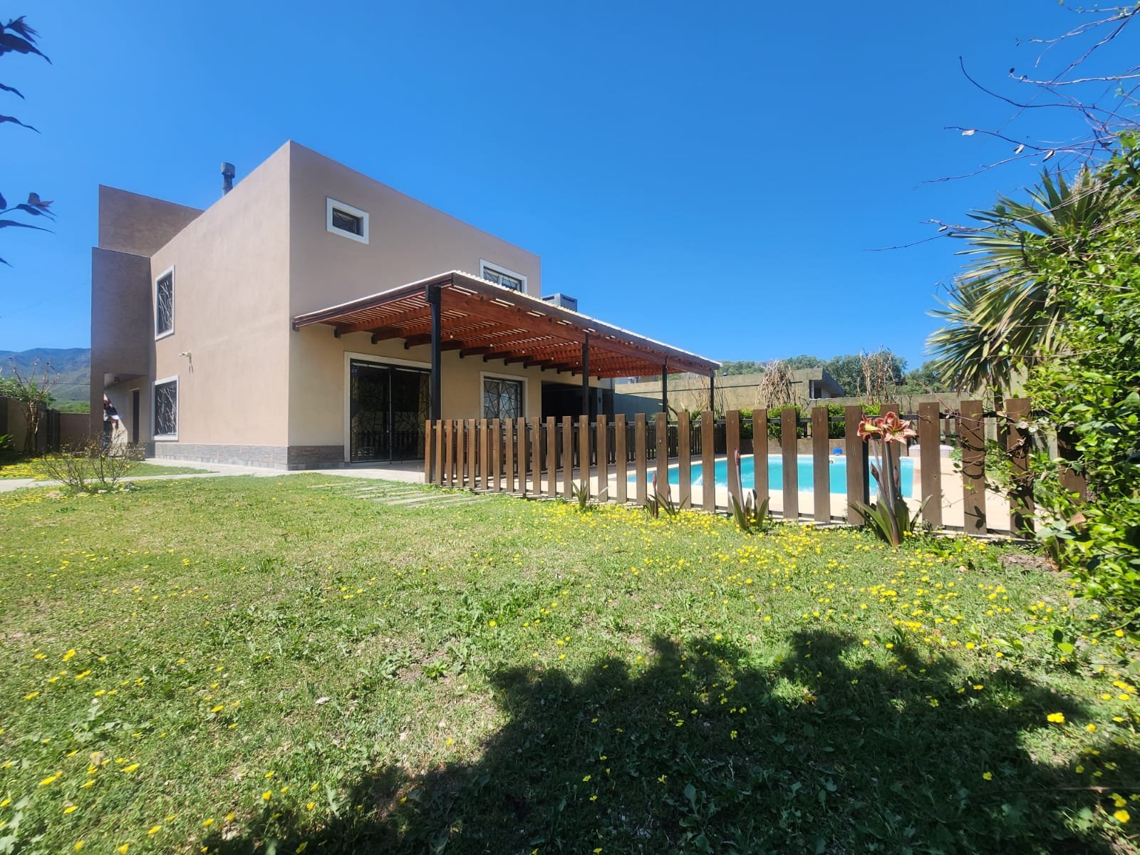 Por fuera hay espacios verdes con plantas de diferentes especies, palmeras, arbustos, un espacio techado tipo leñero con un cuartito cerrado para guardar cosas al lado, casilla para tubos de gas y una pileta.