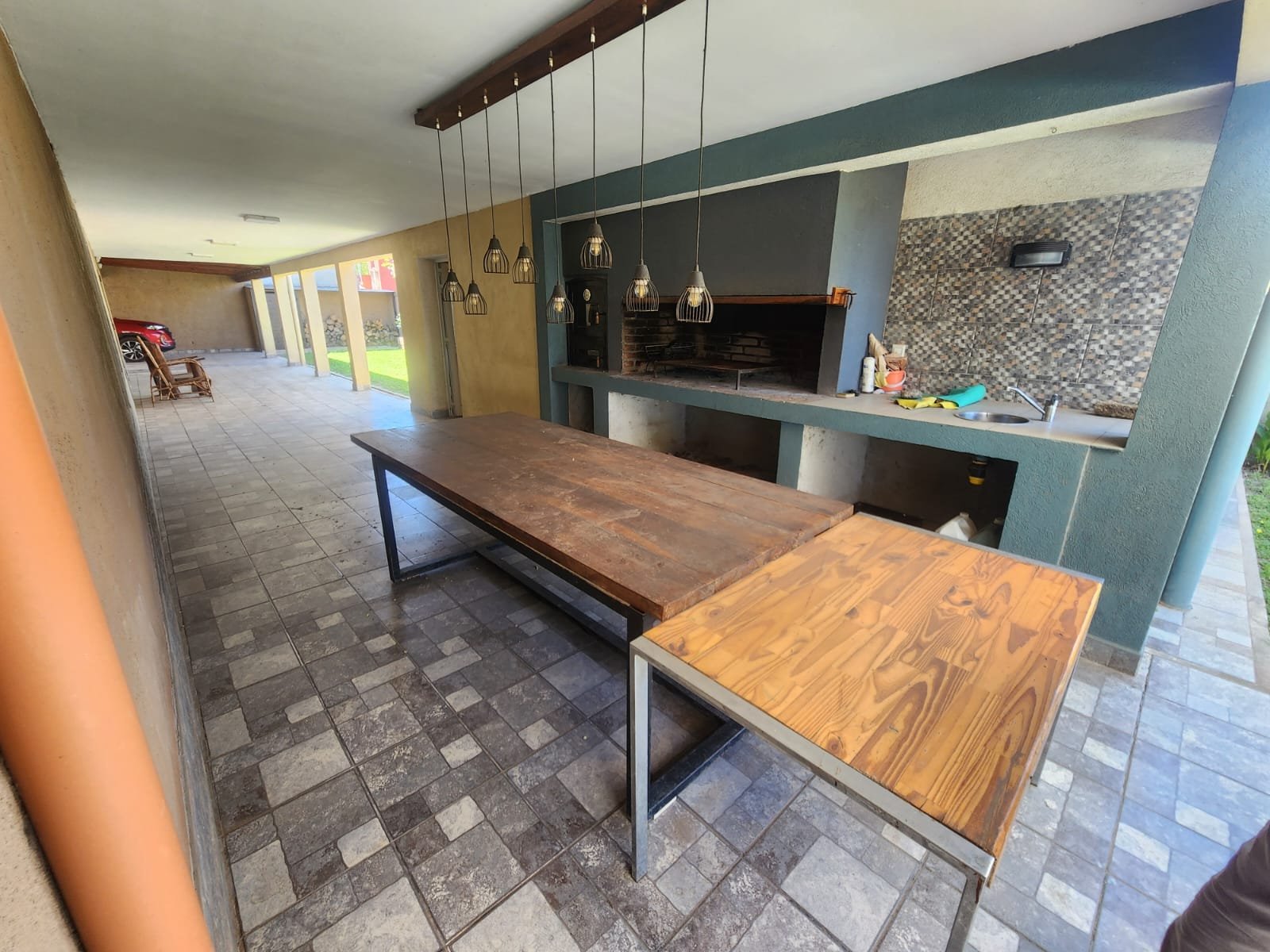1 Galería cochera semicubierta con capacidad para guardar 4 vehículos y en caso de ingresar hacia la galería quincho también tiene capacidad para más de 8 vehículos. La misma tiene acceso desde la calle por medio de dos portones de chapa y está construida con pisos cerámicos alto tránsito, techo de losa y una parte con techo de chapa aislante revestido con madera.