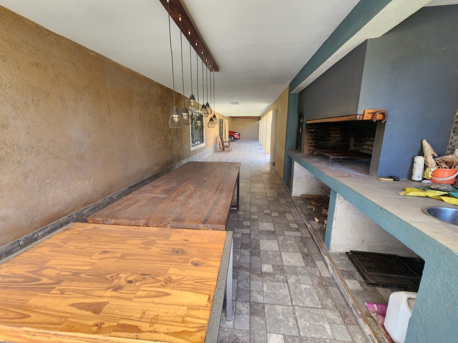 1 Galería tipo quincho con asador grande, mesada de material revestida con cerámicos y bacha de acero inoxidable. La misma tiene techo de losa y pisos cerámicos alto tránsito.