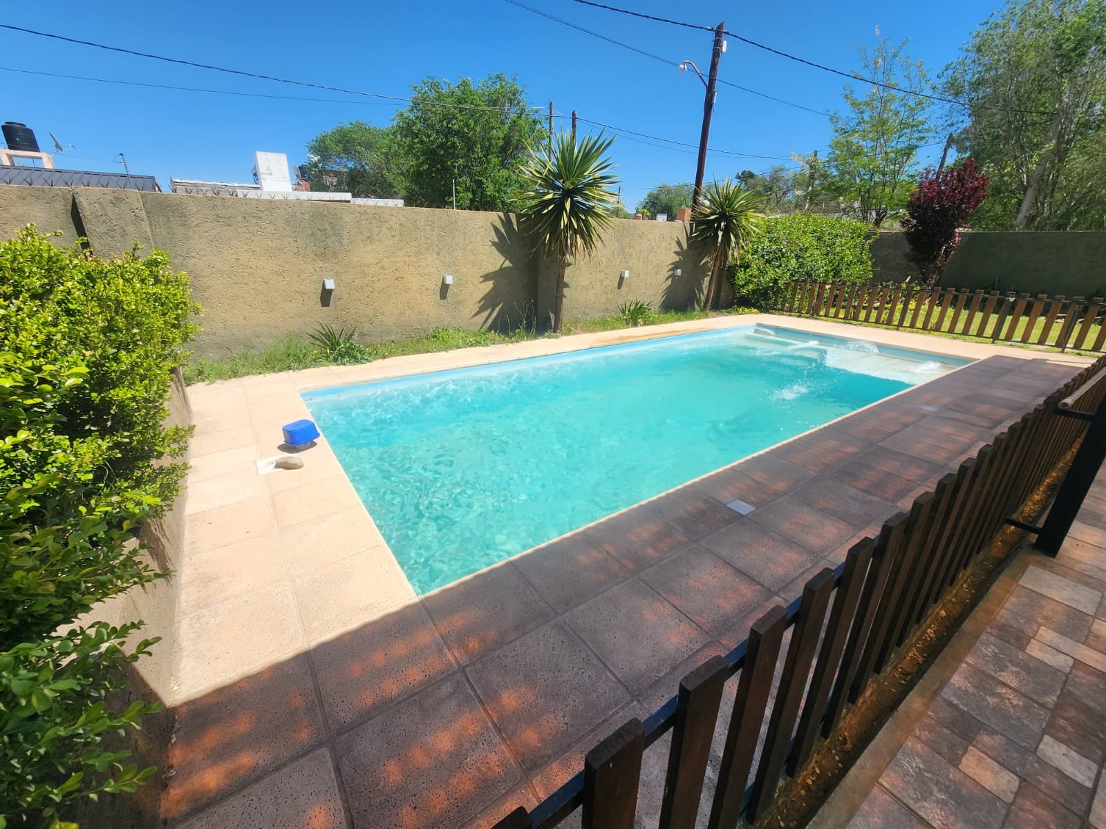 La pileta es de fibra de vidrio y mide 8 metros de largo x 3,70 metros de ancho con todo el equipo de filtrado completo, losetas térmicas y todo el perímetro delimitado con cerca de madera.
