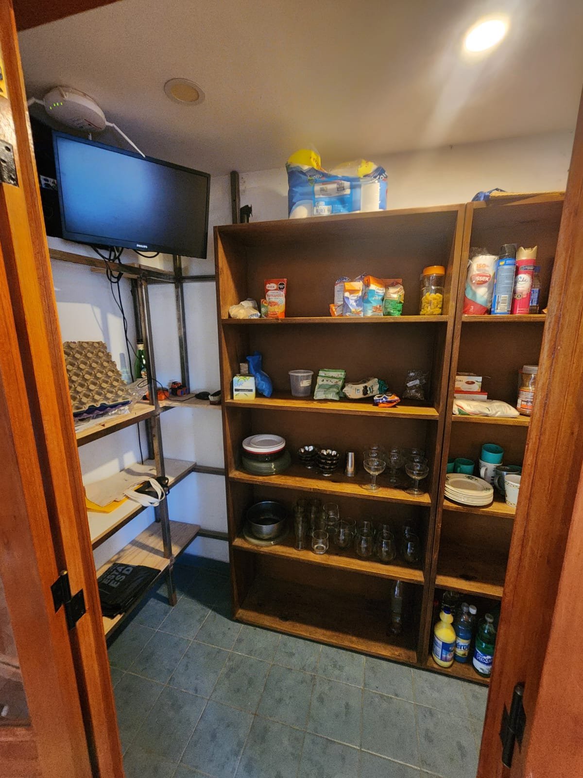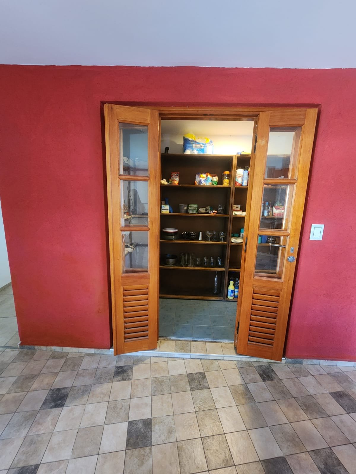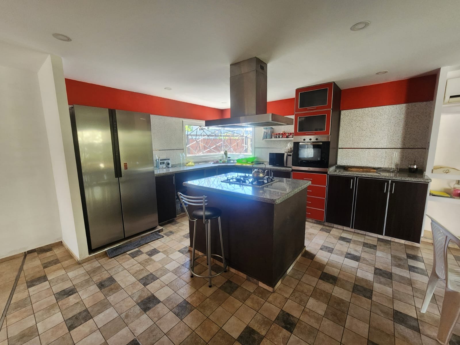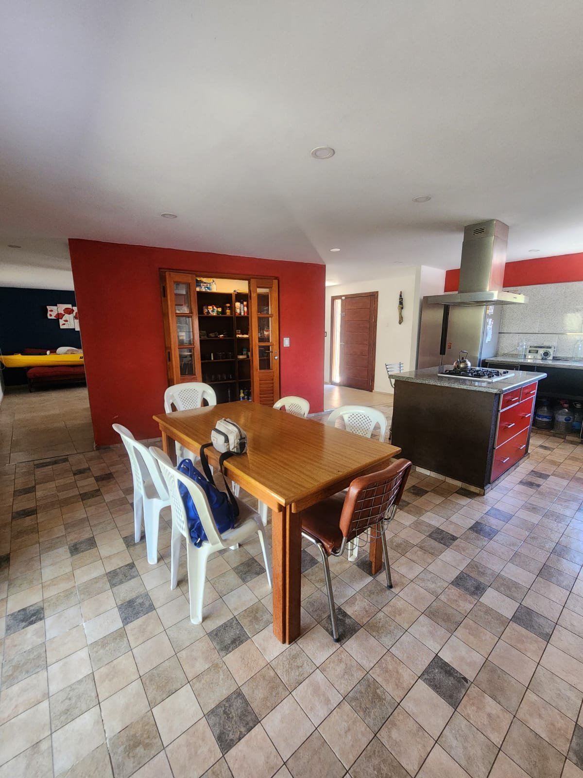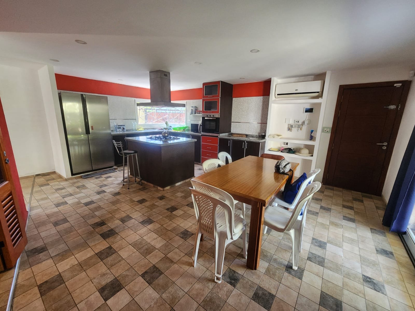 1 Cocina comedor luminosa con aire acondicionado frio/calor. La cocina se compone de bajomesada de melamina, mesada de mármol granito con bacha de acero inoxidable, horno empotrado, la pared revestida con cerámicos, isla con base de melamina y mesada de granito más anafe, extractor de humo y un gran despensero con espacio para que entre una persona para acomodar y estantes, construido de material con puertas de madera y pisos cerámicos.