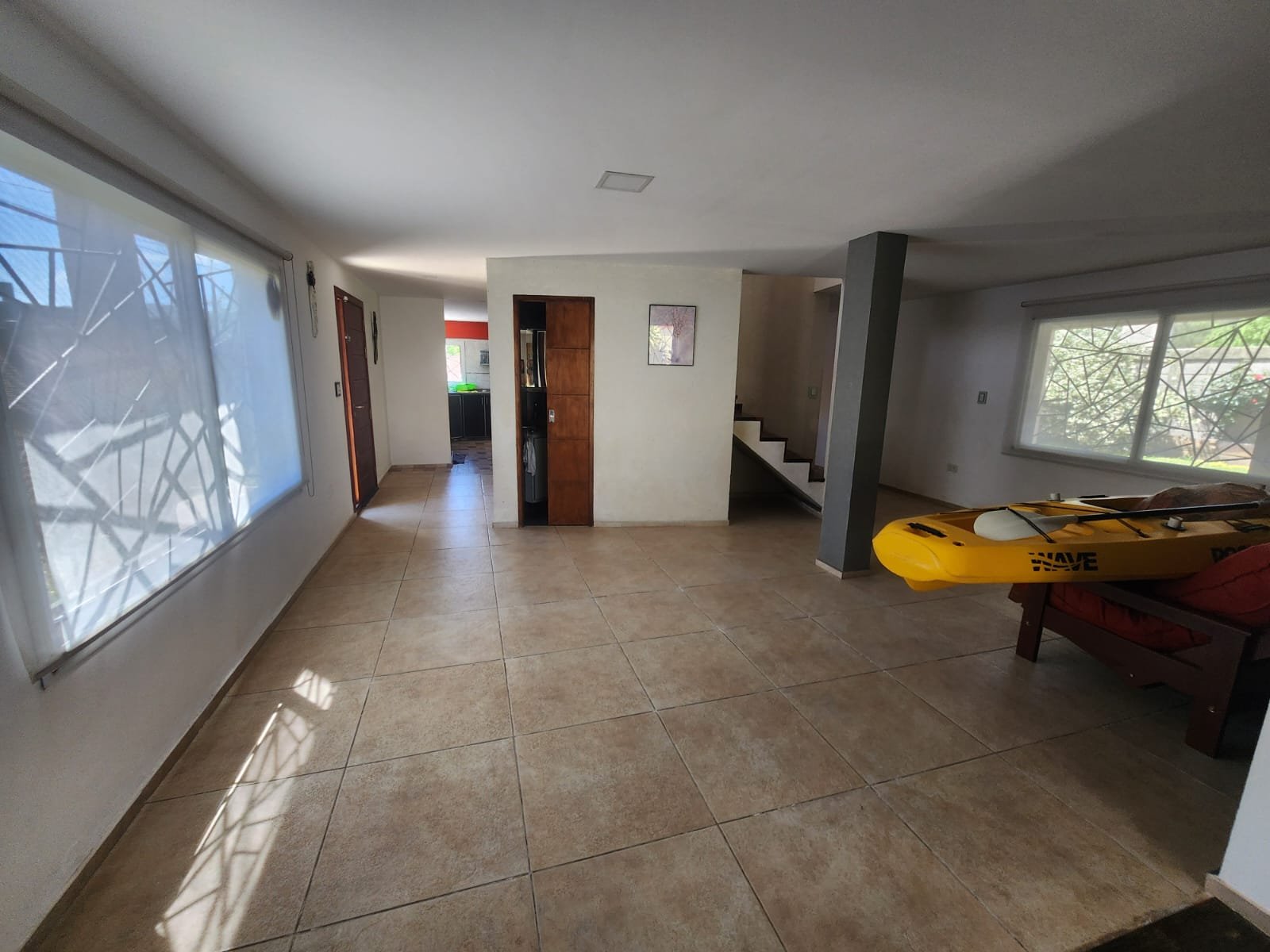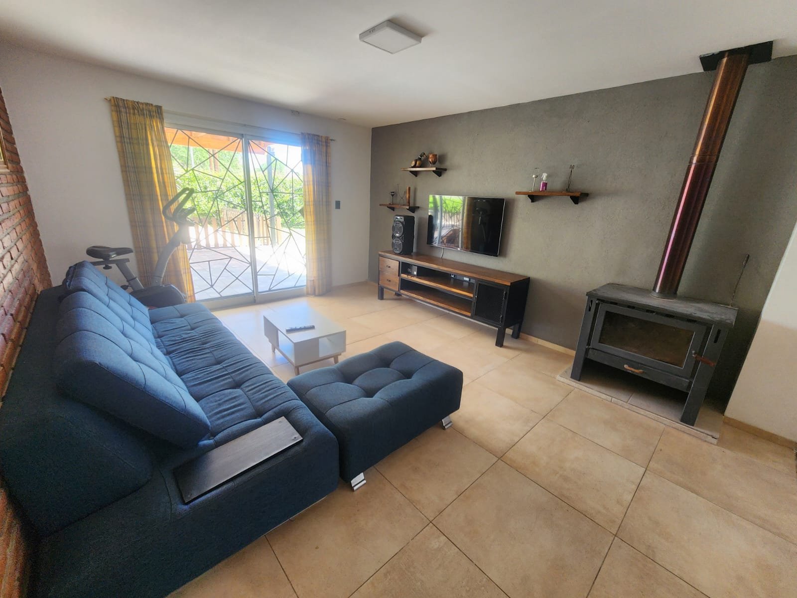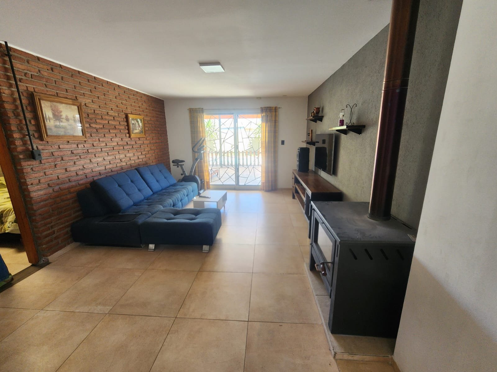 1 Living amplio con salamandra tipo tromen para calefaccionarse y una pared con ladrillos vistos. Cuenta con una puerta ventana para salir a la galería y pileta.