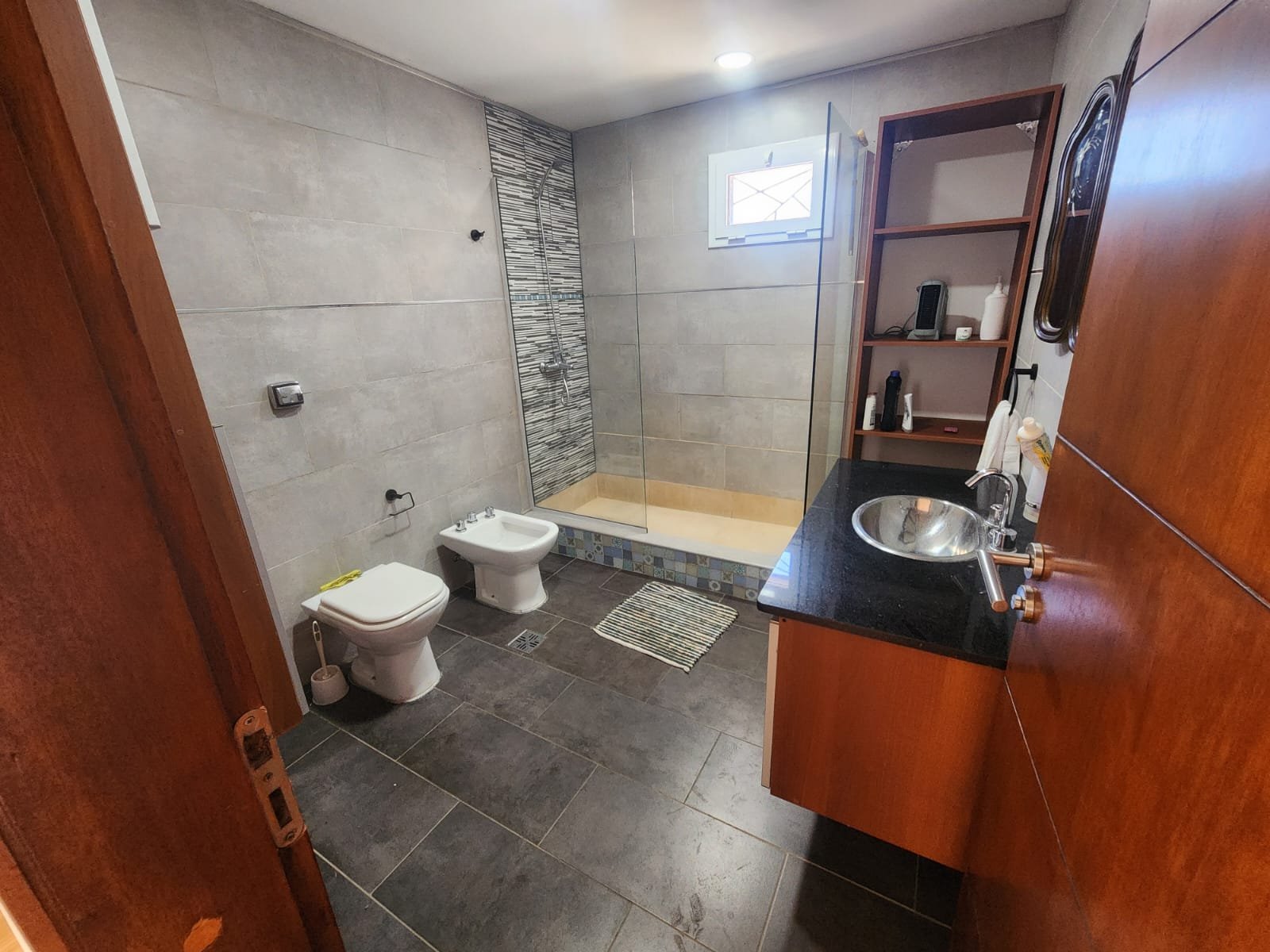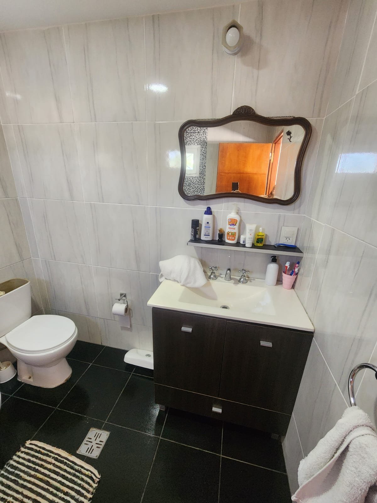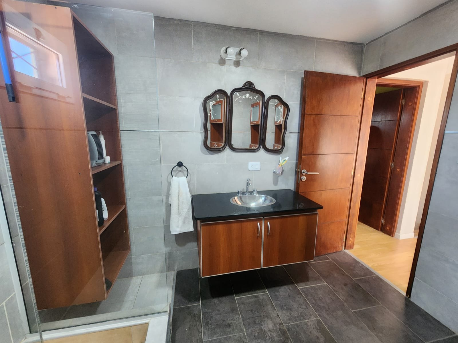 1 Baño grande de estilo moderno completo con todos sus accesorios. Este mismo se compone de vanitory de melamina amplio con mesada de mármol negro y pileta para lavarse las manos de acero inoxidable, mobiliario de melamina para guardar toallas y elementos de higiene personal, inodoro, bidet y ducha con mampara de vidrio.