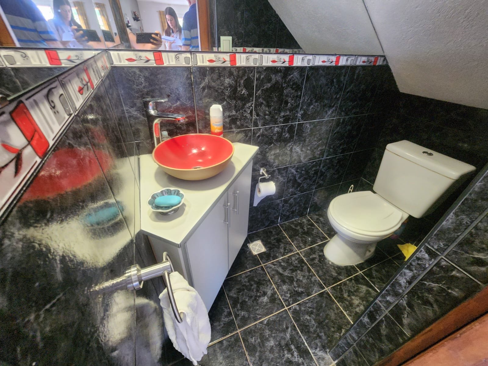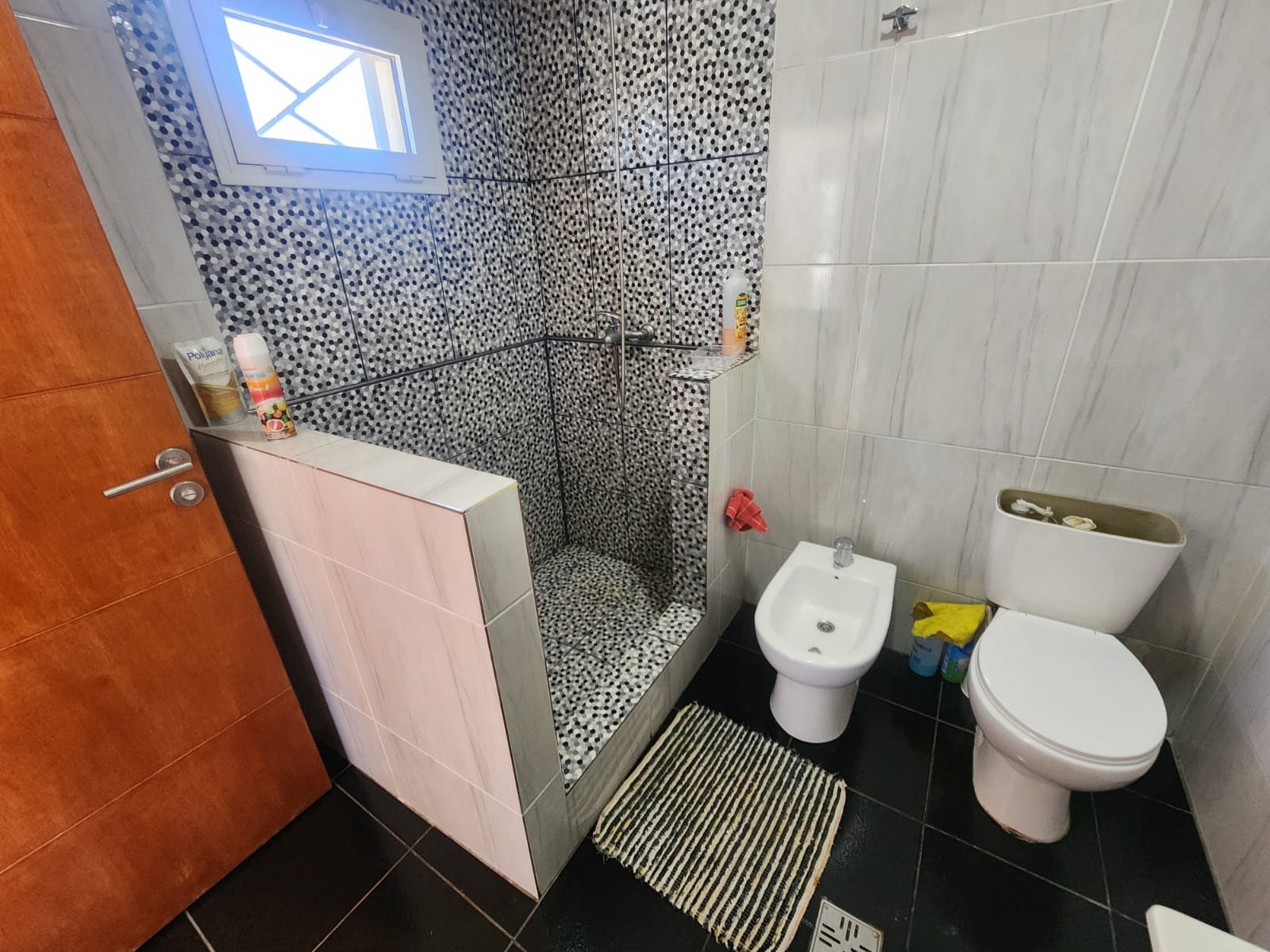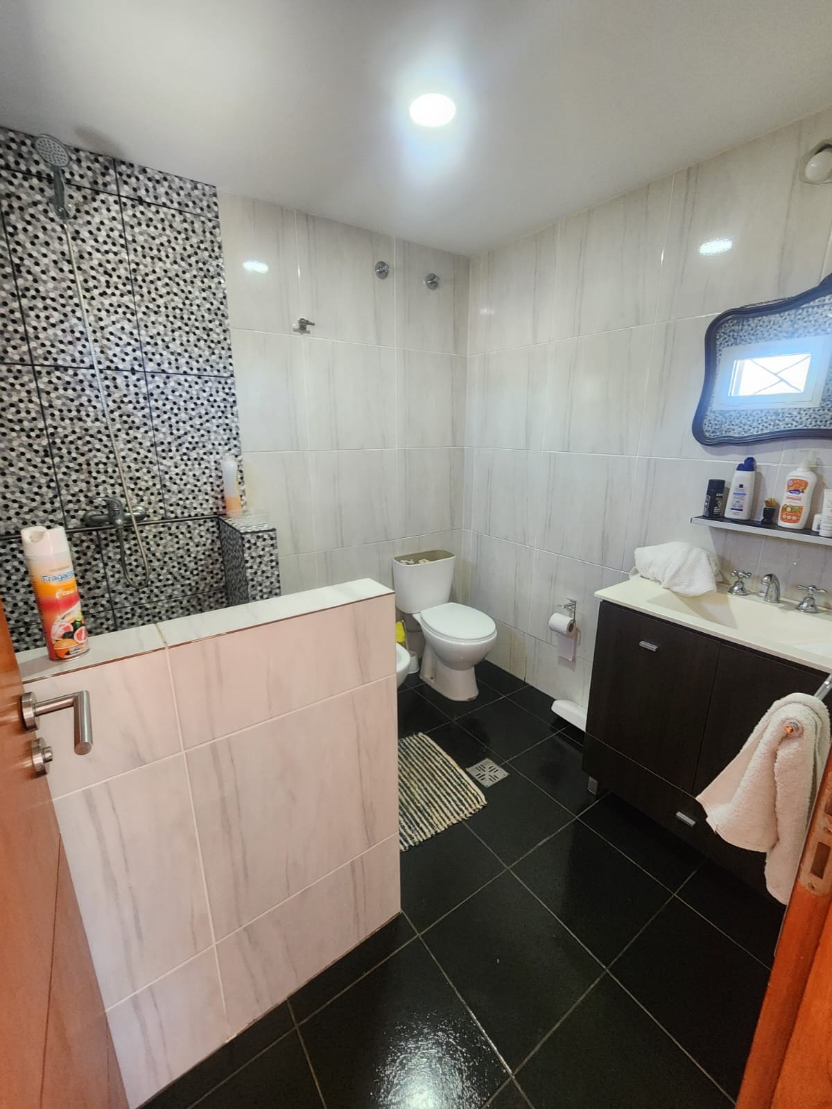 1 Baño grande de estilo moderno completo con todos sus accesorios. Este mismo se compone de vanitory de melamina amplio con mesada de mármol negro y pileta para lavarse las manos de acero inoxidable, mobiliario de melamina para guardar toallas y elementos de higiene personal, inodoro, bidet y ducha con mampara de vidrio.