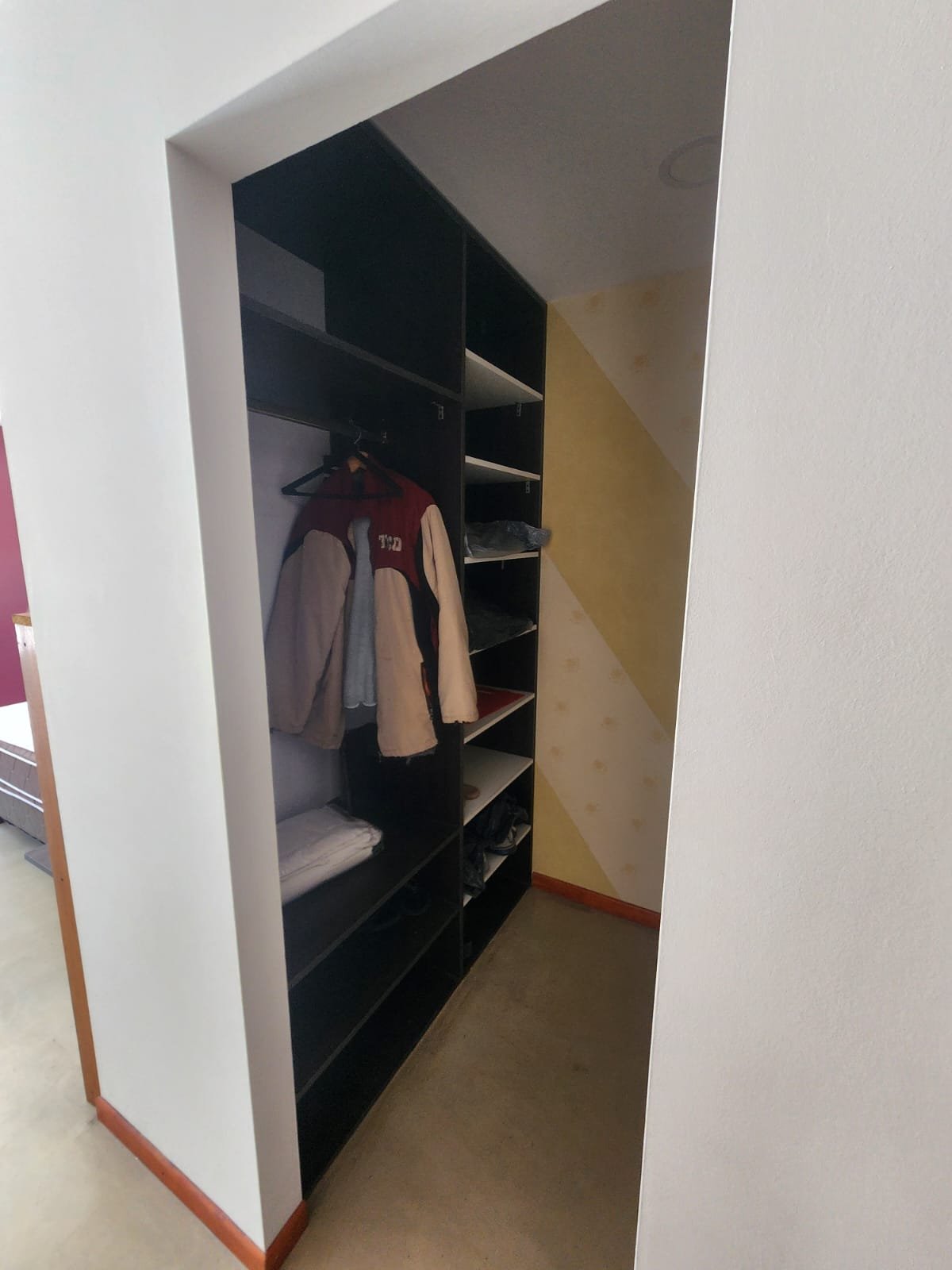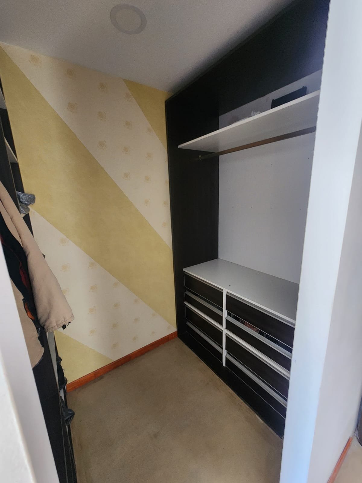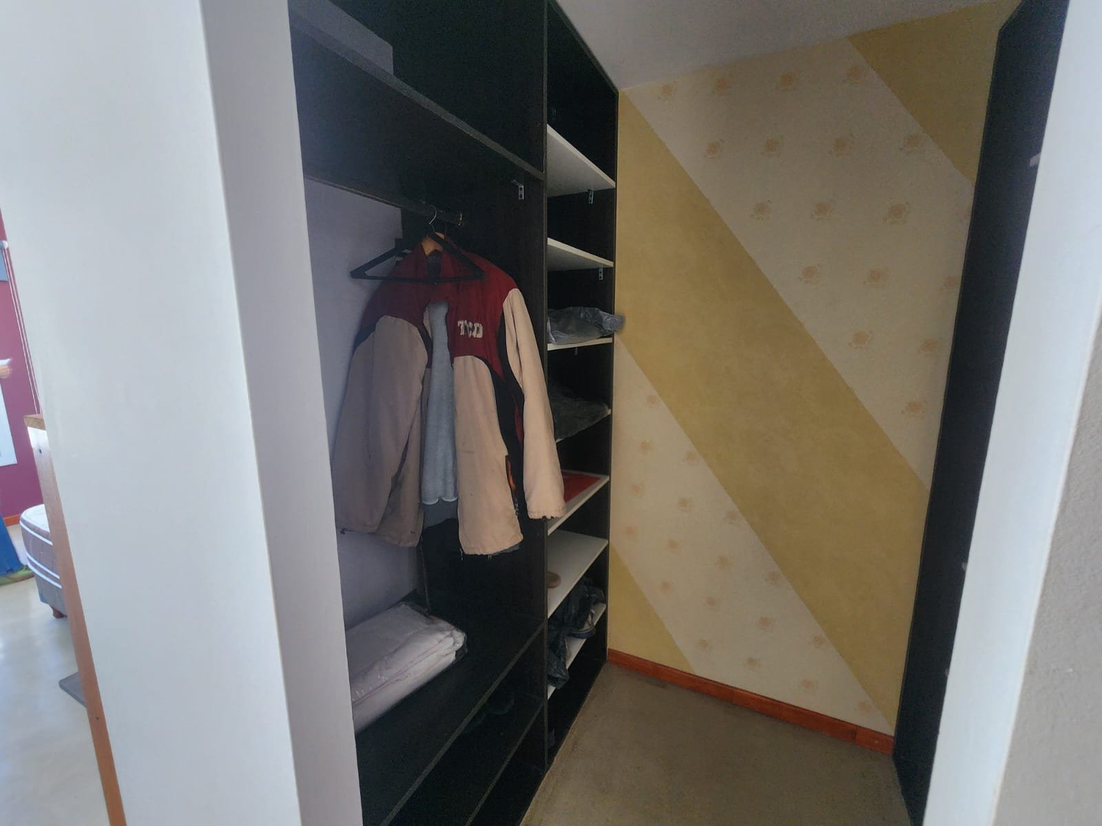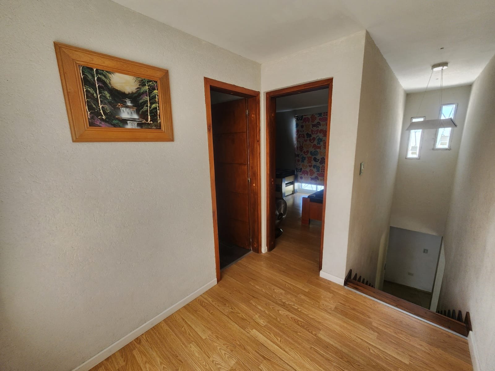 1 Pasillo que separa los ambientes muy luminoso con un armario de piso a techo empotrado en la pared para guardar cosas. Este espacio tiene pisos flotantes de madera.