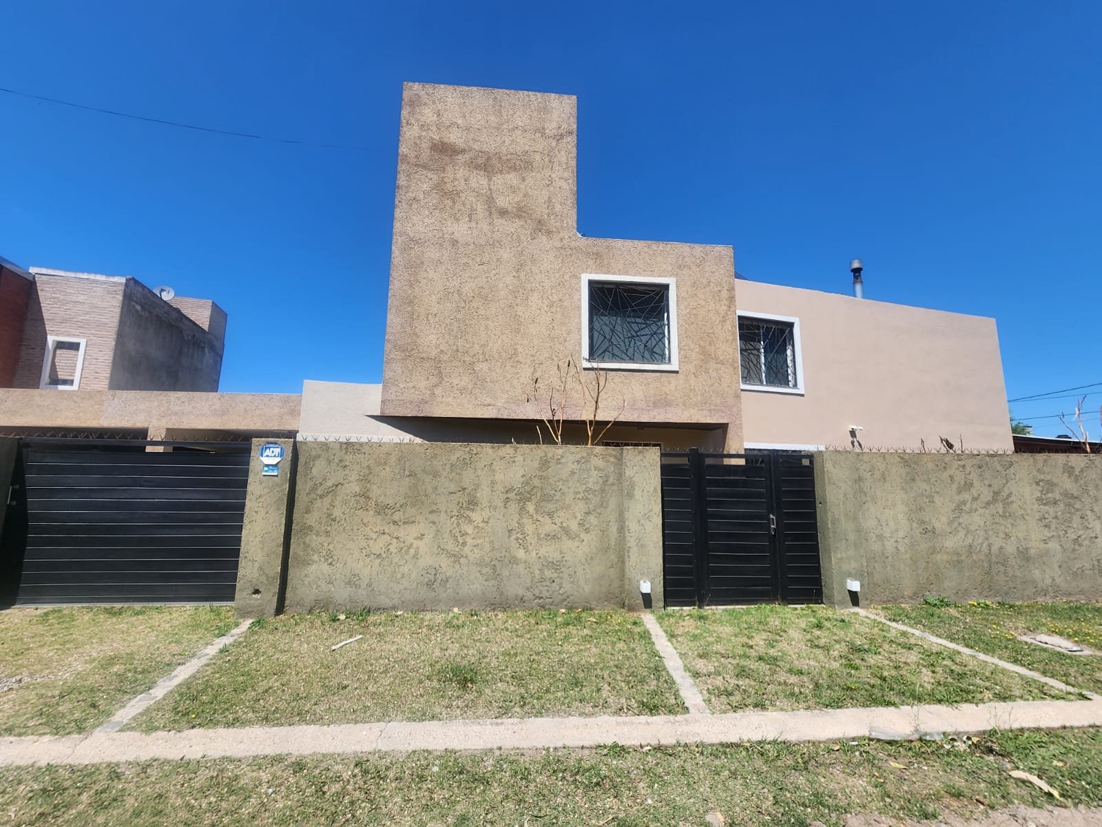 Muy segura con alarma. Todo el perímetro está cerrado con muros de material, 2 portones de chapa para el acceso de vehículos y una puerta de chapa.