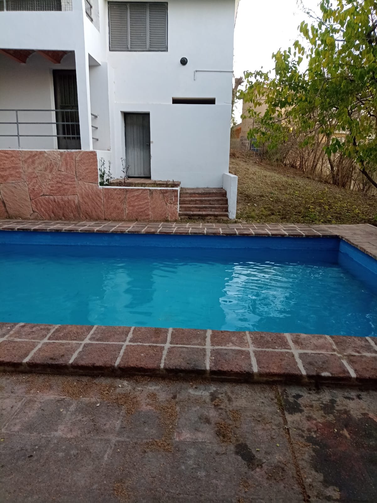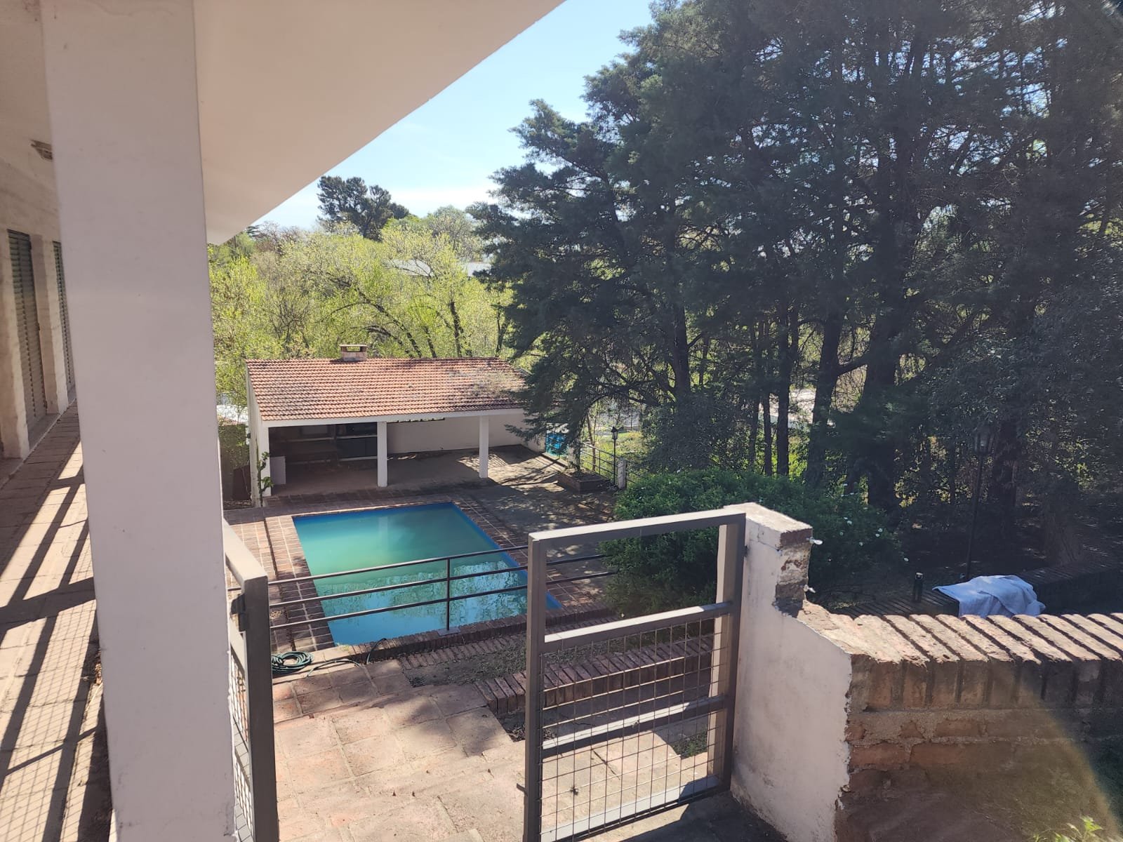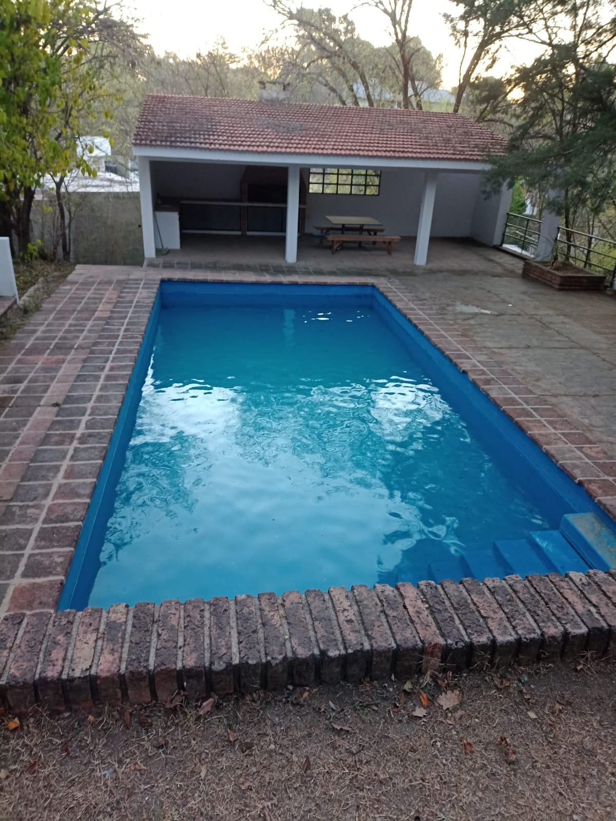 Por fuera una pileta de gran tamaño y un quincho semicubierto con asador, este último tiene paredes de material, techo de losa con tejas y piso con ladrillo.