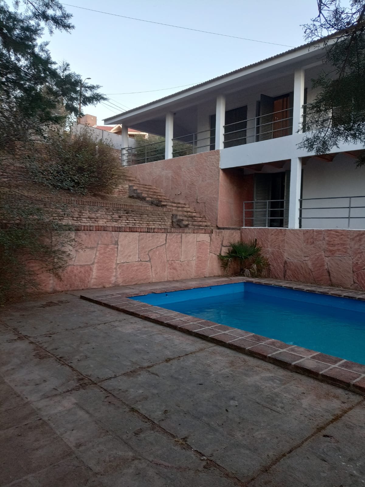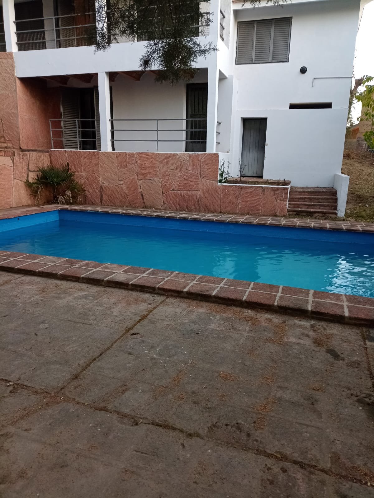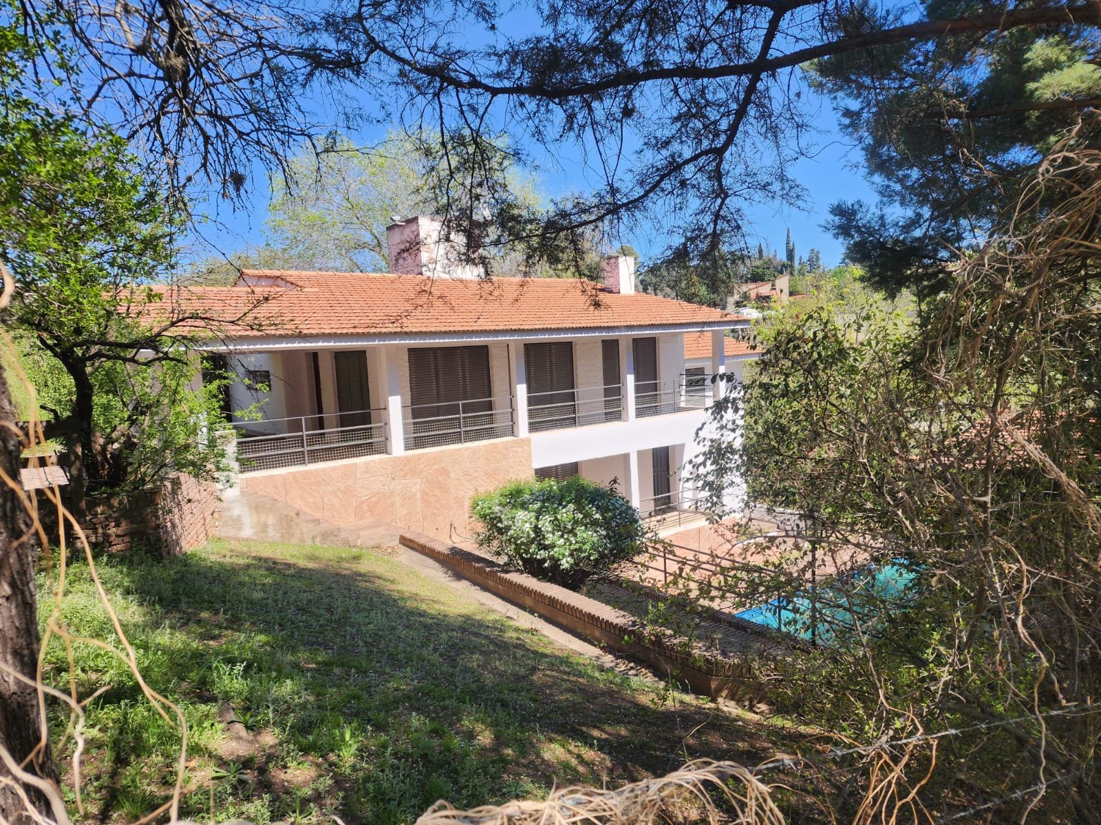 Por fuera una pileta de gran tamaño y un quincho semicubierto con asador, este último tiene paredes de material, techo de losa con tejas y piso con ladrillo.