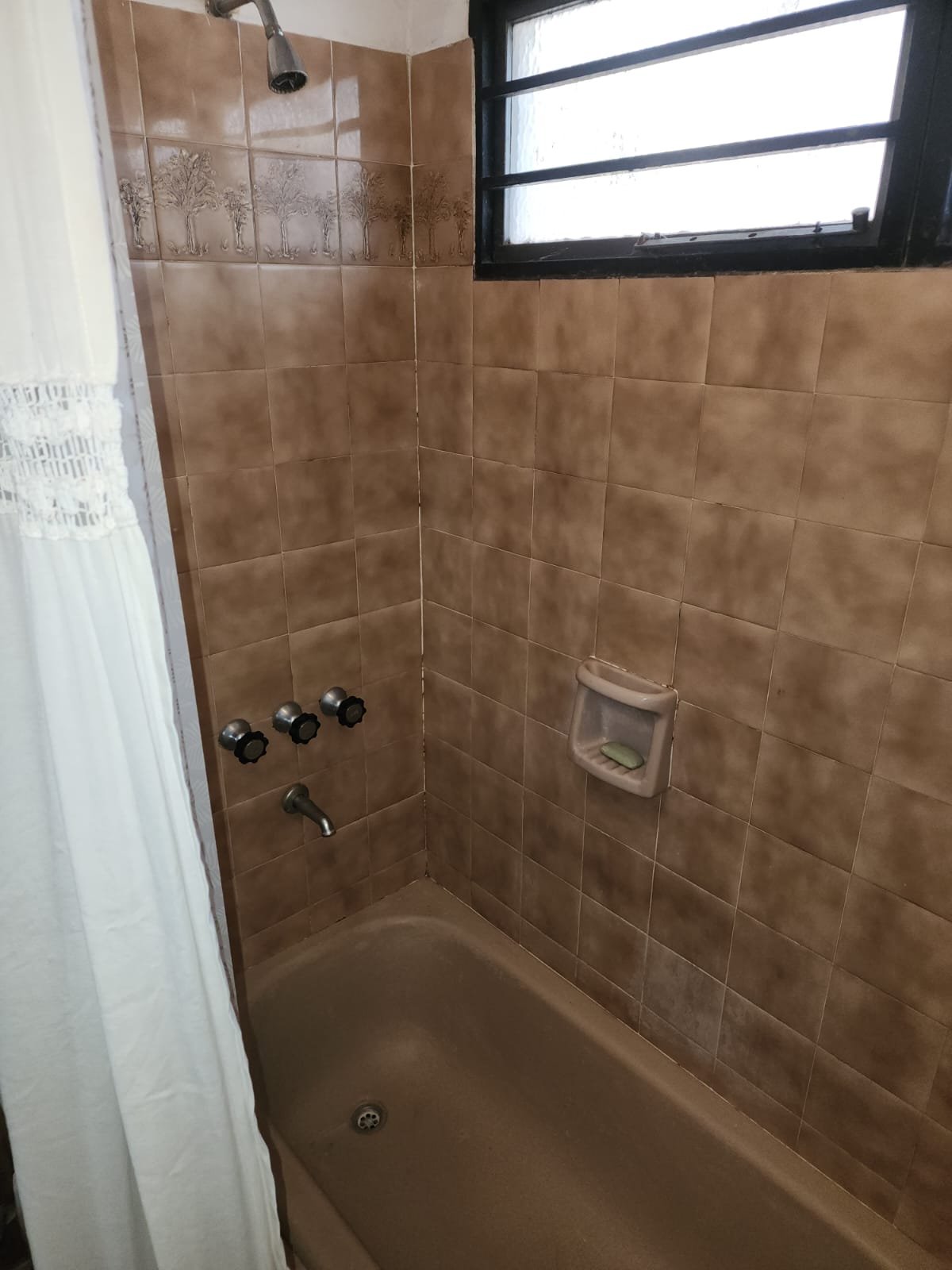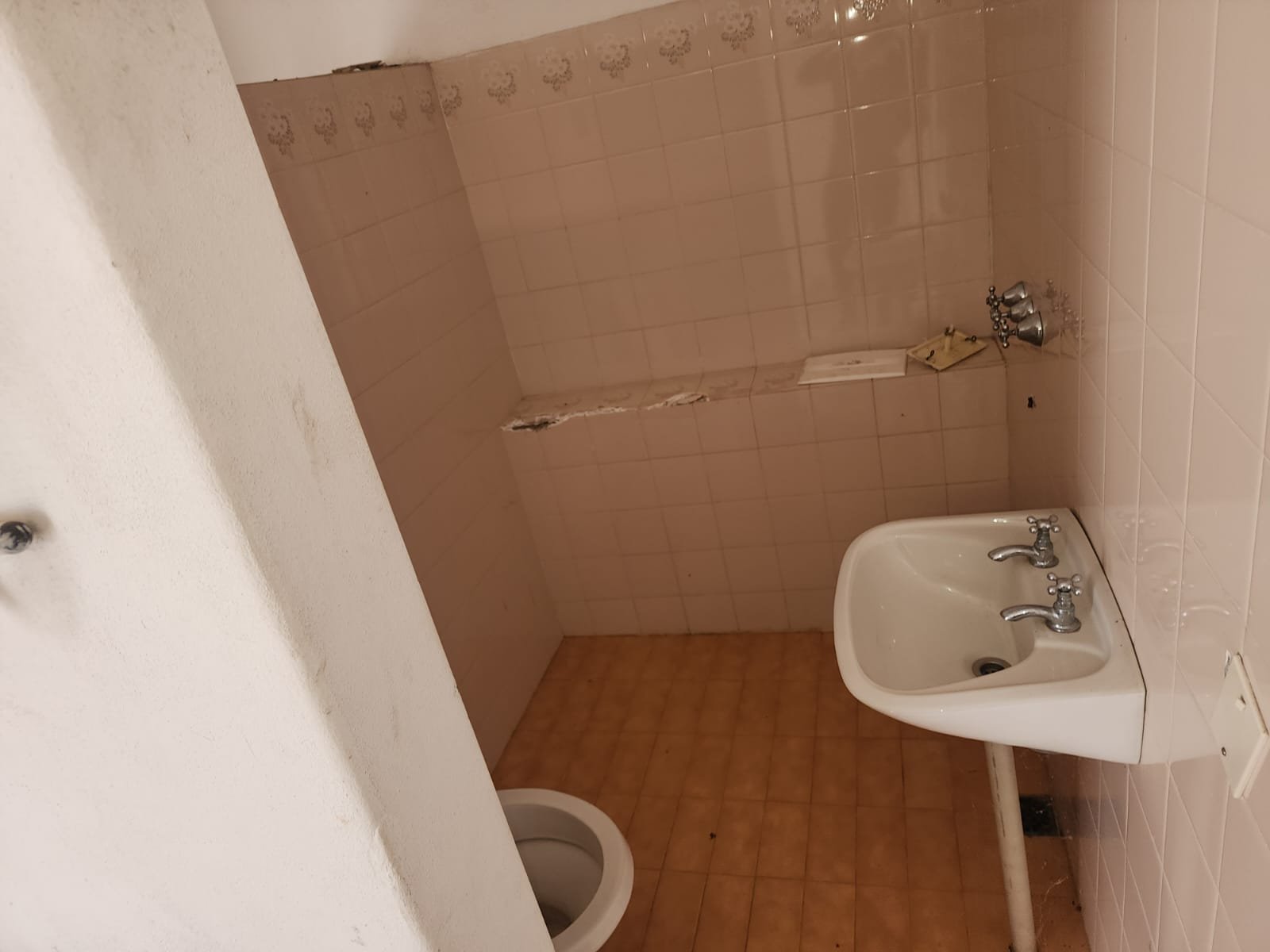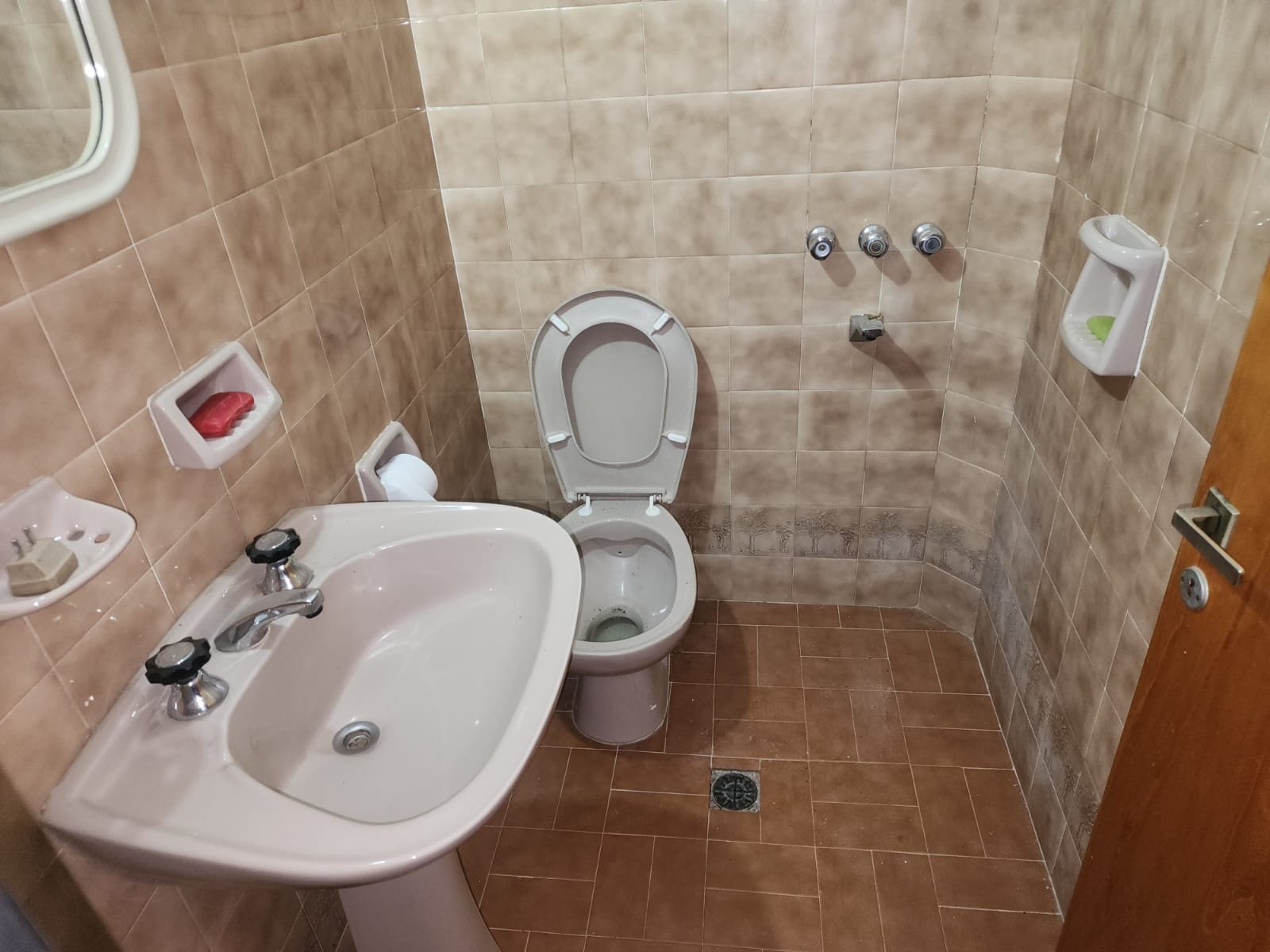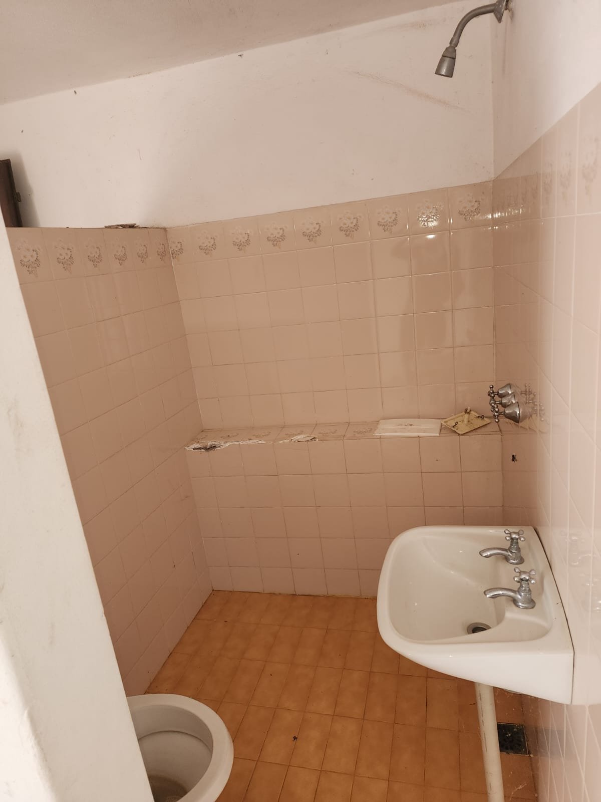 1 Baño social con pileta para lavarse las manos, inodoro, ducha y la pared revestida con cerámicos.