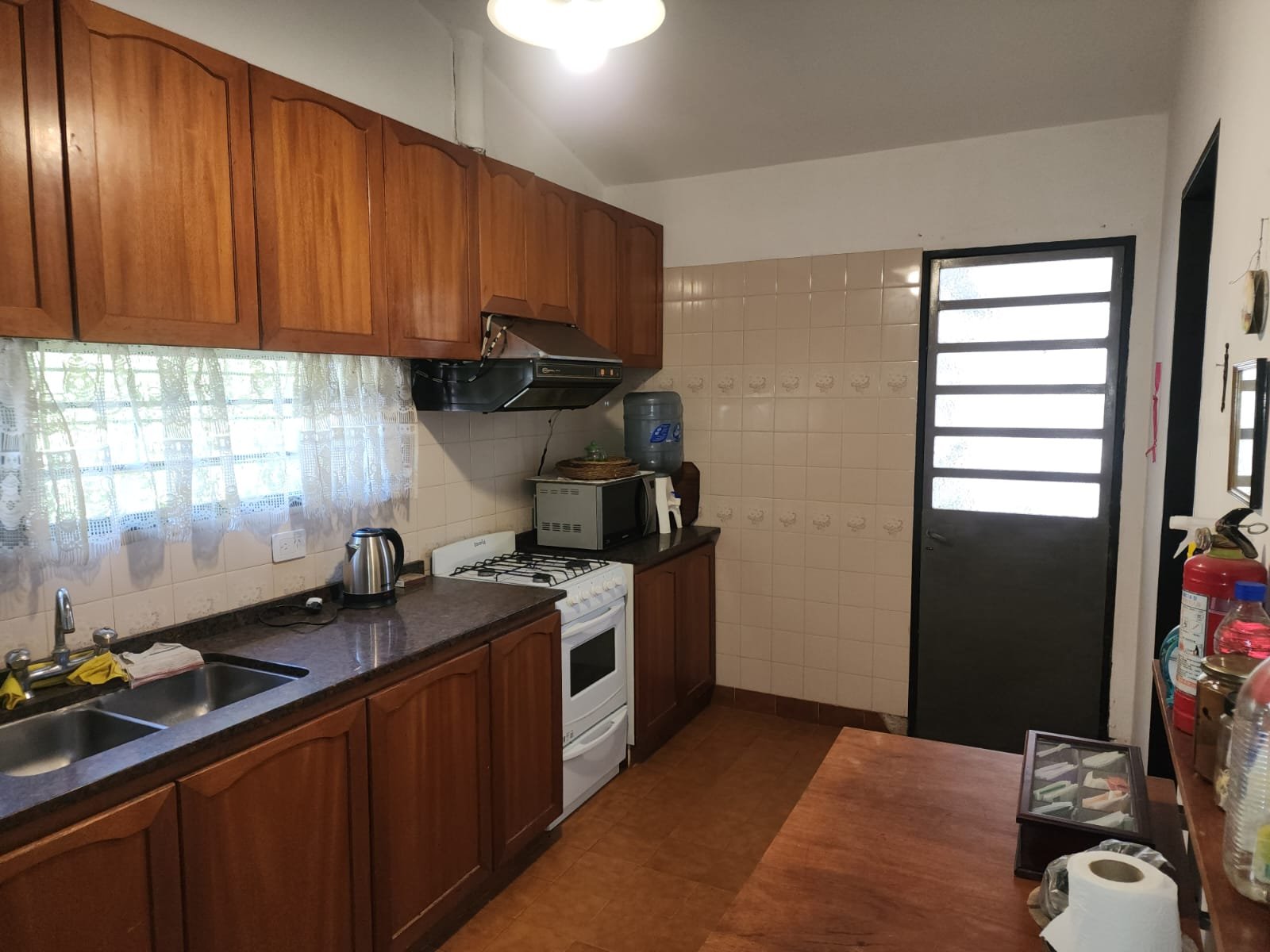 1 Cocina compuesta por alacenas y bajomesada de madera, mesada de mármol granito con doble bacha de acero inoxidable y la pared revestida con cerámicos.