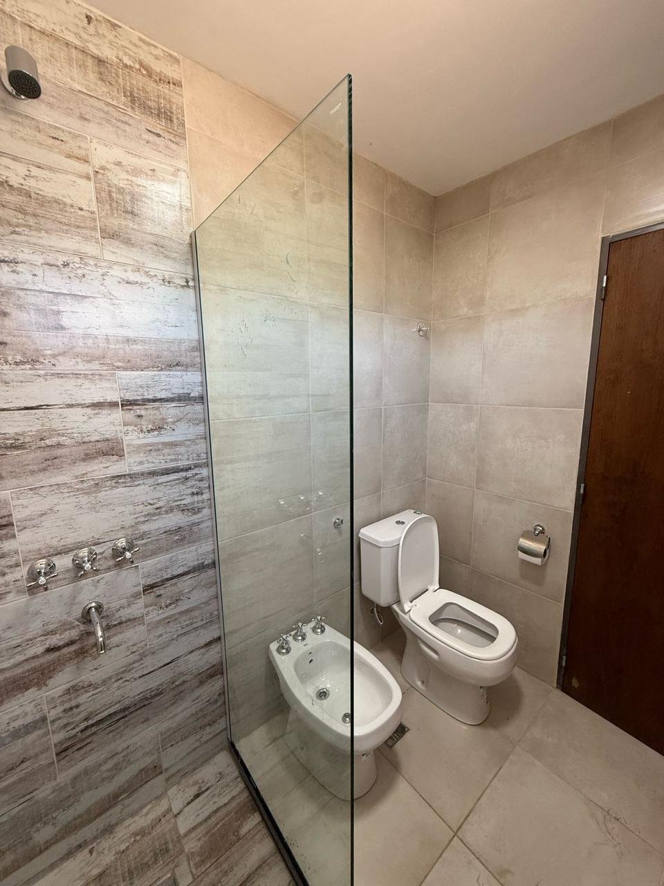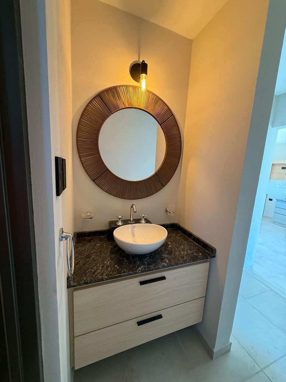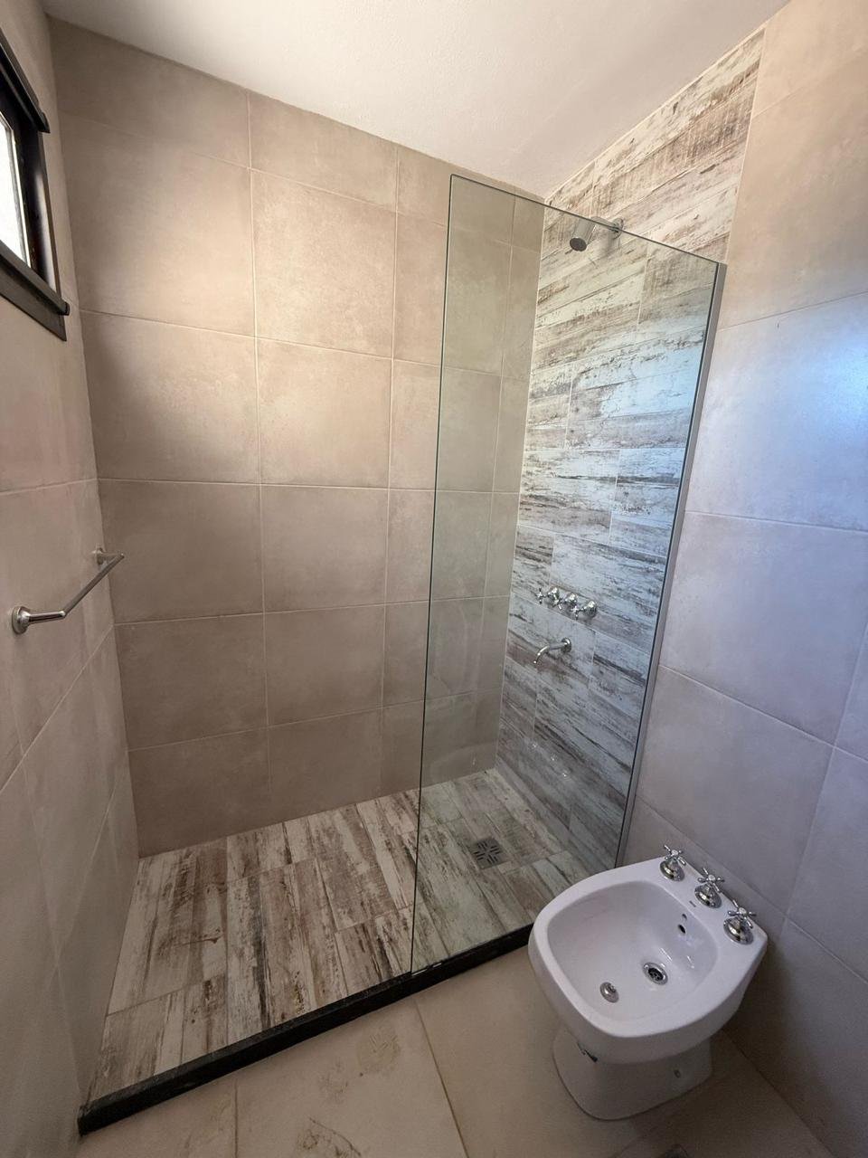 1 Baño de estilo moderno completo con todos sus accesorios sectorizado con Ante baño primero y separado por una puerta el inodoro, bidet y ducha. El mismo se compone de vanitory de melamina 18mm con mesada en granito natural, bacha tipo cuenco enlozada, espejo redondo de hierro, grifería Fv, sanitarios Roca y mampara de vidrio templado 10mm.