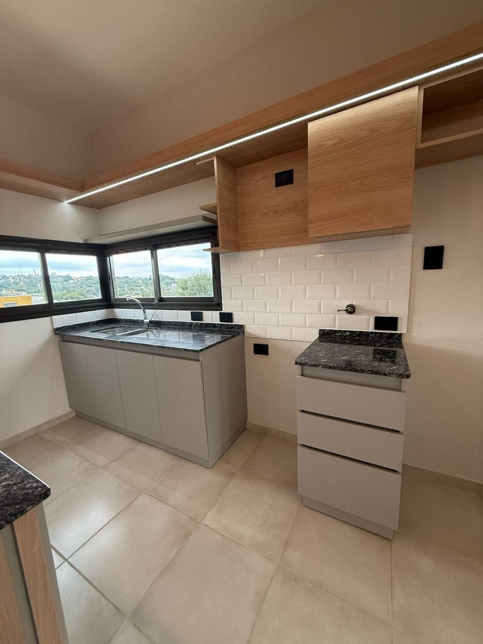 1 Cocina living comedor de gran tamaño con buena luminosidad, ventilación y además una puerta ventana que conecta con la cochera quincho. La cocina tiene bajomesada y estantes de melamina 18mm primera calidad, mesada de granito natural con bacha doble Johnson de acero inoxidable y la pared revestida con cerámicos símil ladrillitos blancos.