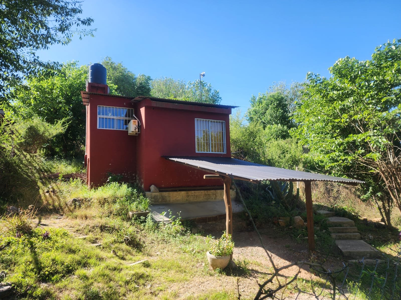 1 Cochera semicubierta con capacidad para guardar un vehículo. La misma se encuentra en el frente, construida con postes de madera y techo de chapa.