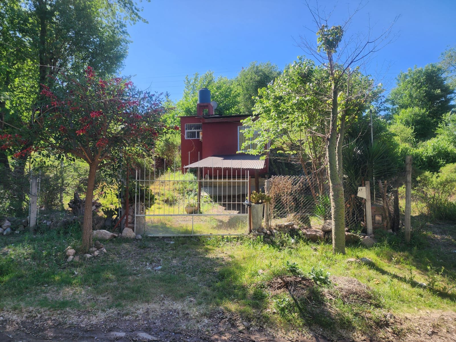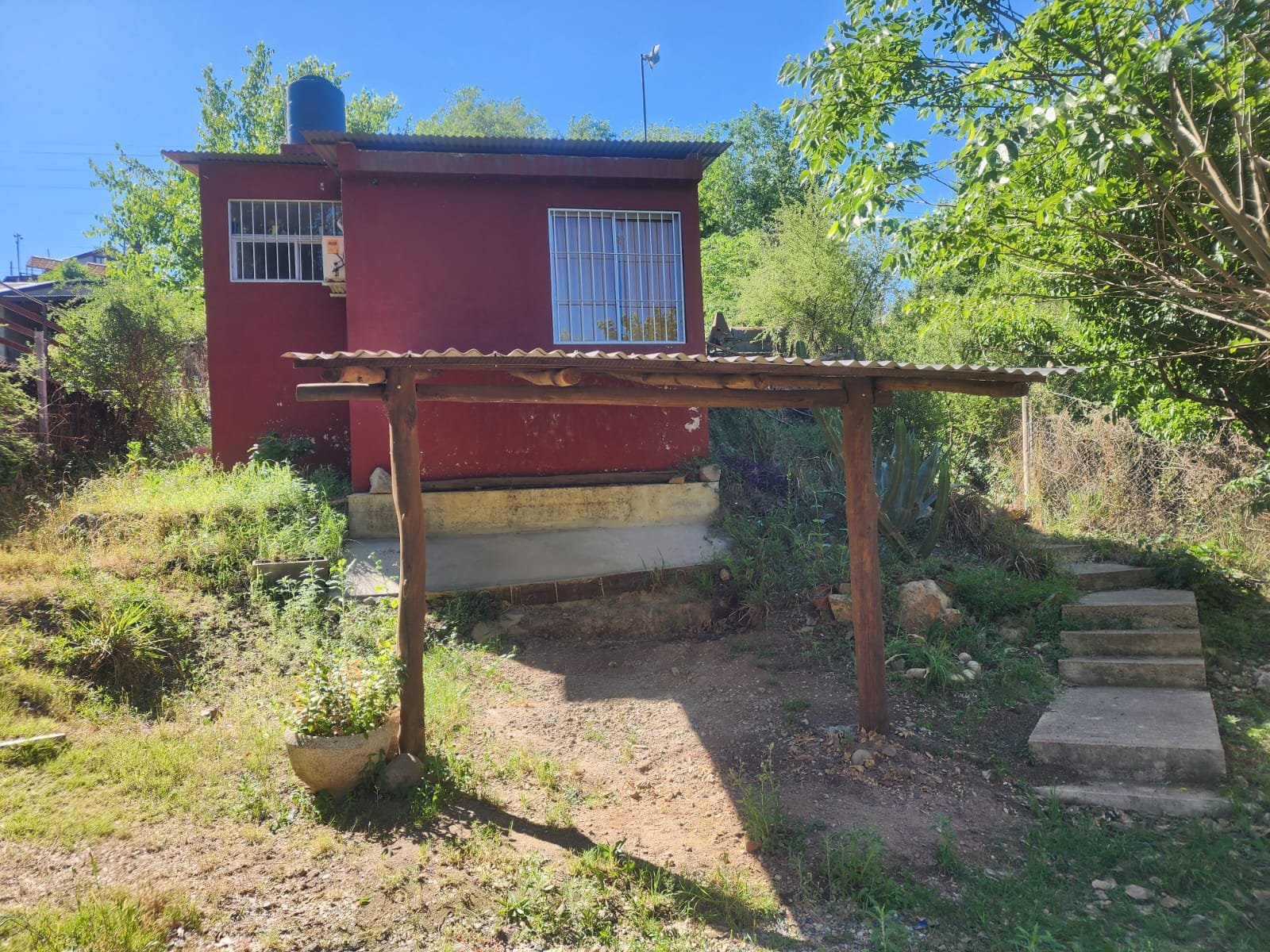 El lote presenta pendiente positiva con respecto a la calle y el acceso de la casa es por medio de una escalera de material.