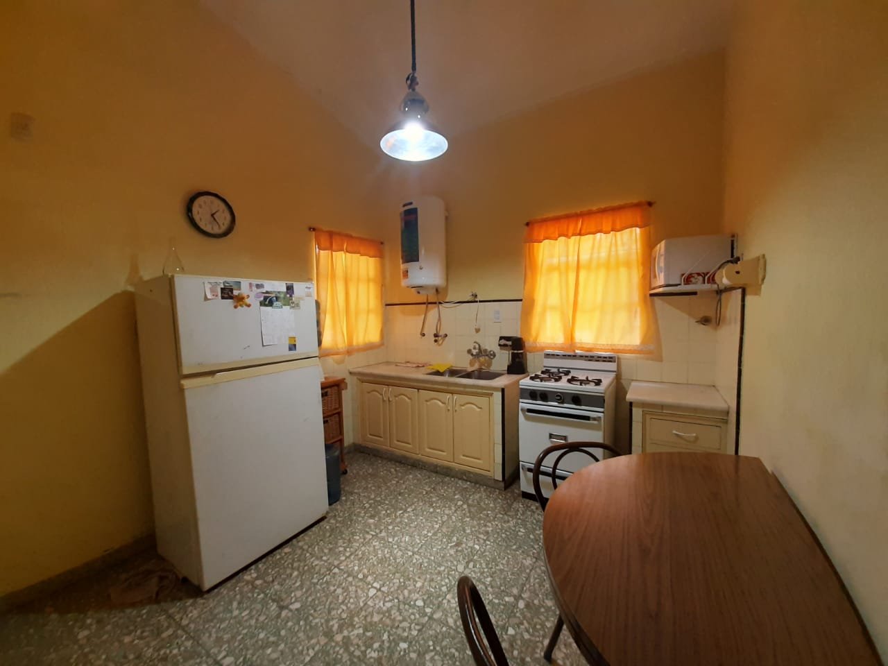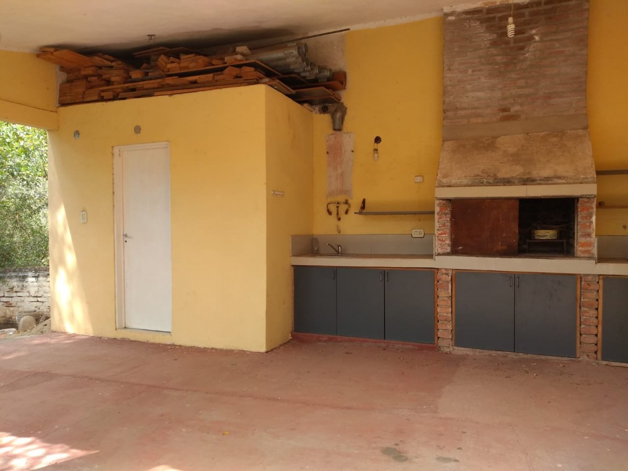 – Una cocina quincho abierta, calefón a gas, mesada de material revestida con porcelanato, bacha de acero inoxidable, bajomesada de melanina y asador.