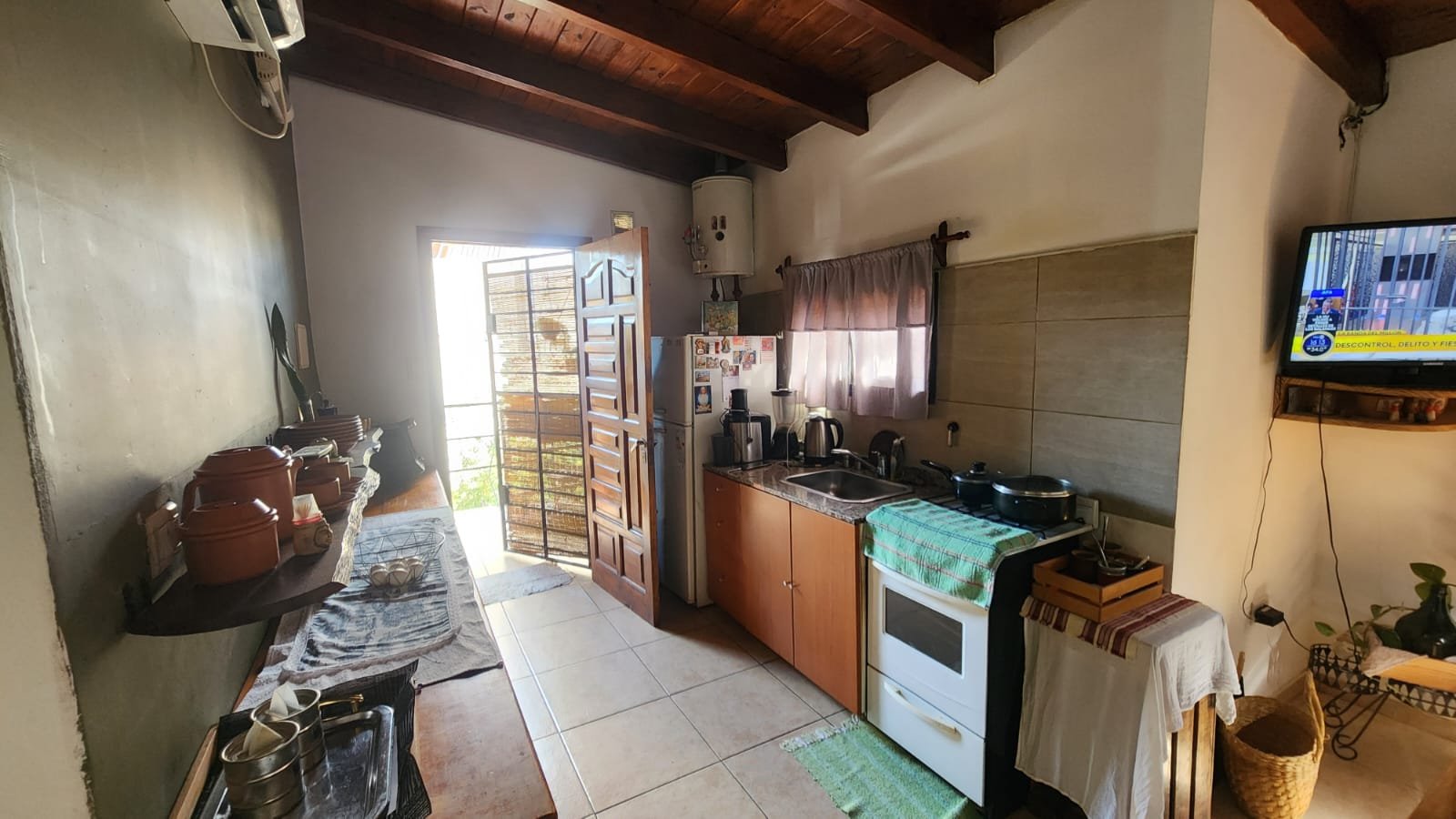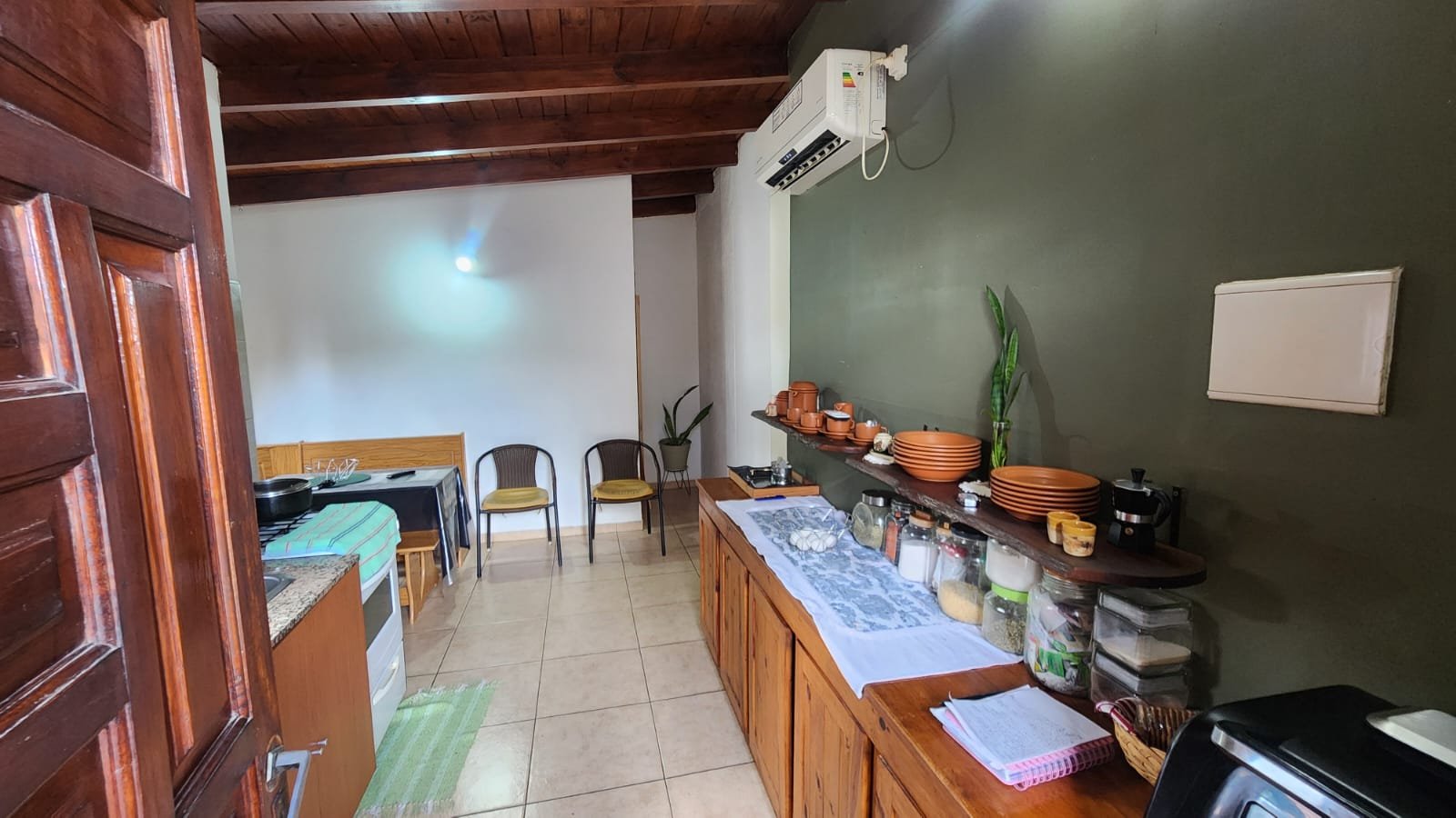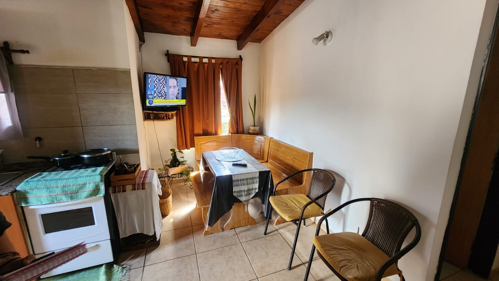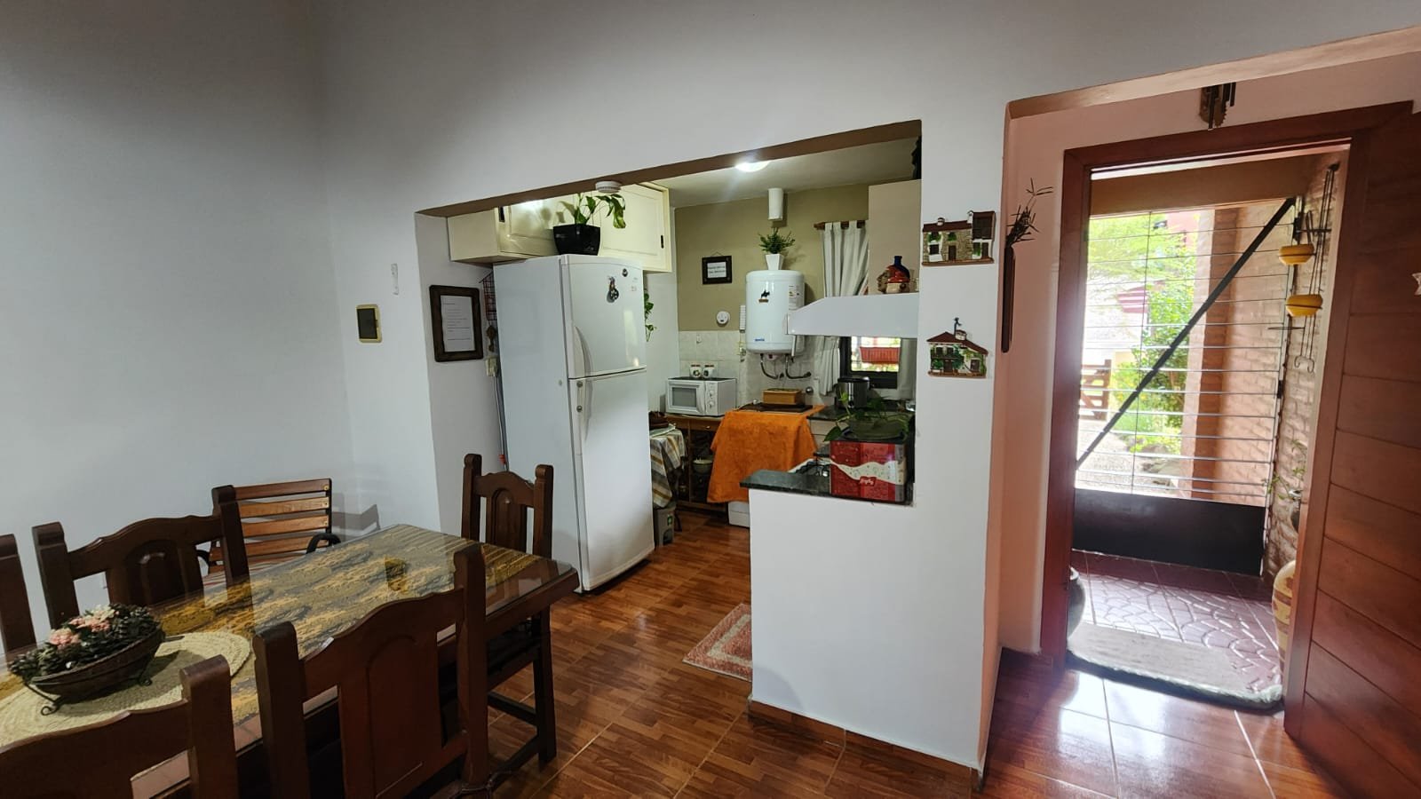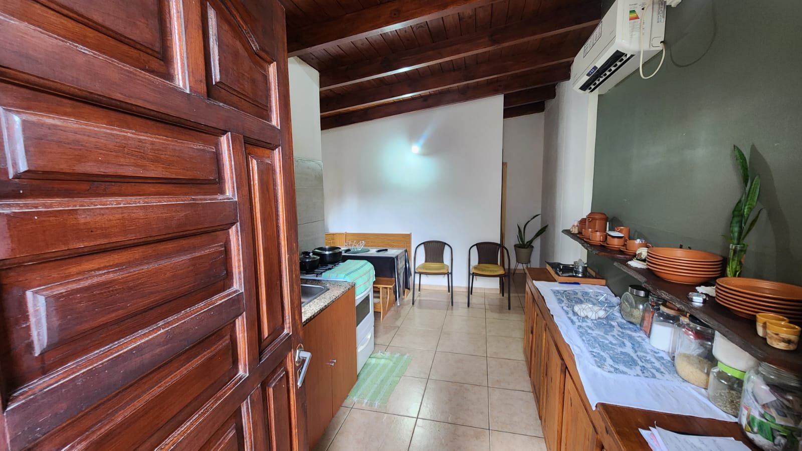 Dispone de cocina comedor con aire acondicionado, termotanque a gas, mesada de granito, bajo mesada, muebles de guardado, repisas de madera y bacha de acero.