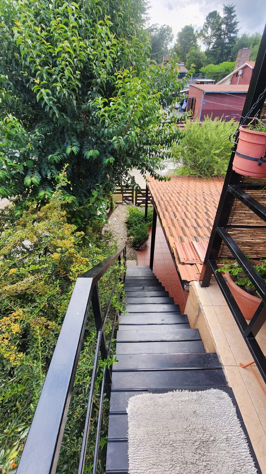 Desde el living, una escalera de caño con peldaños de madera conecta con el departamento mediante puerta corrediza.