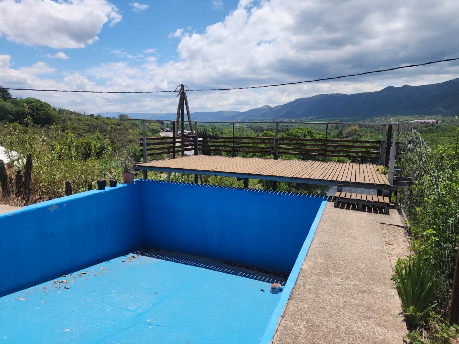Por fuera hay patio con una pileta construida de material con todo el equipo completo de filtrado más un deck como mirador, construido con estructura y barandas de caño más piso de madera.