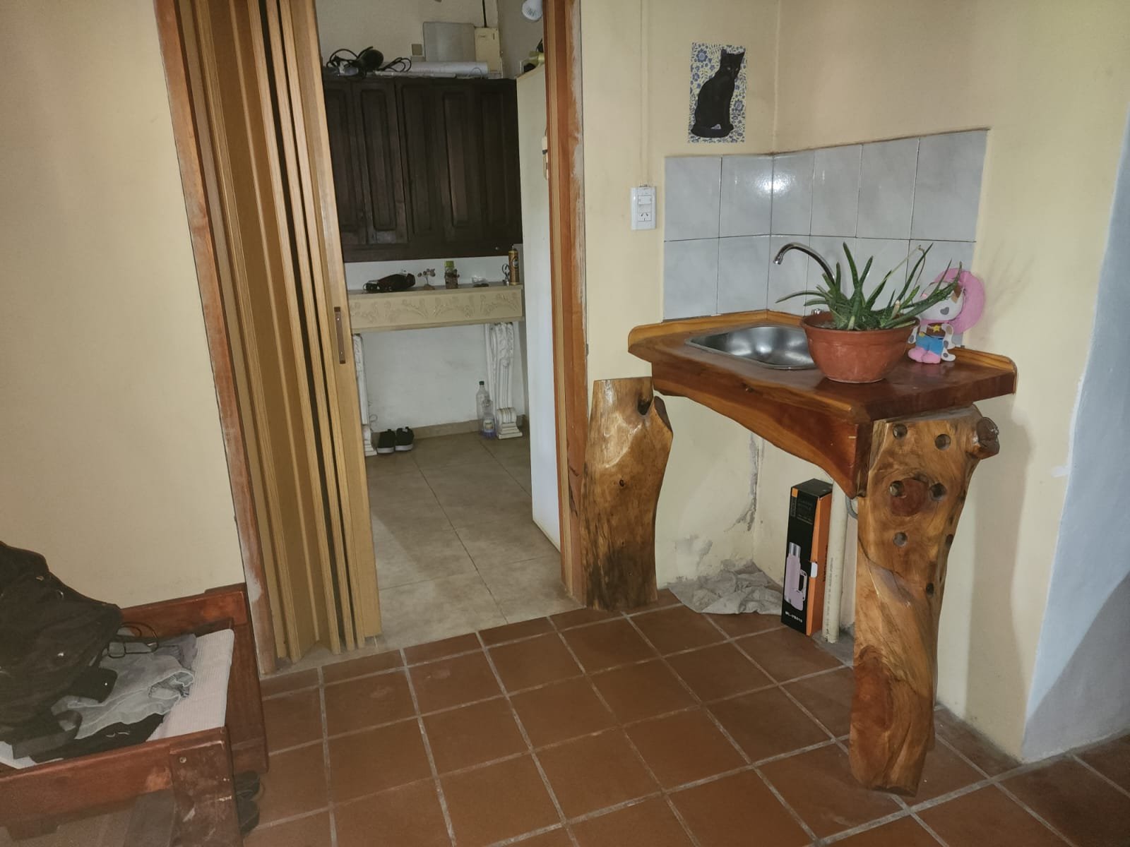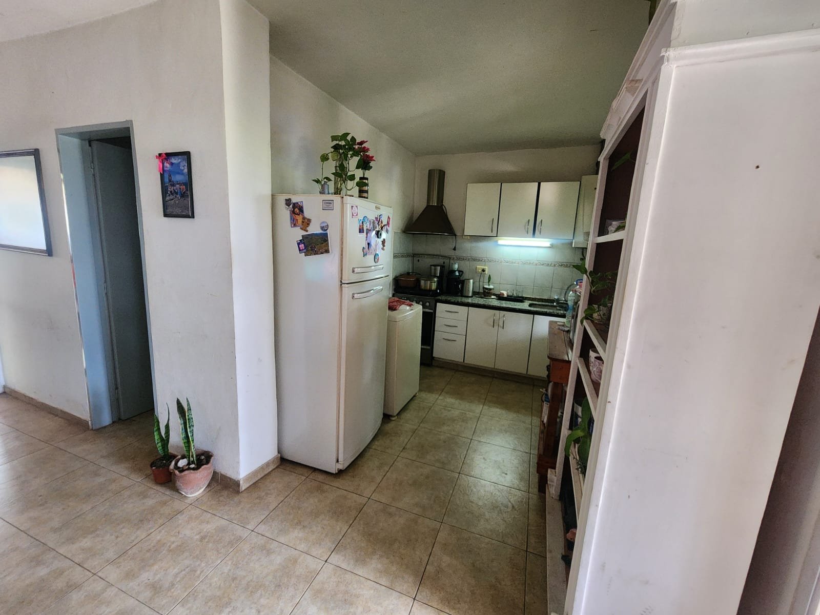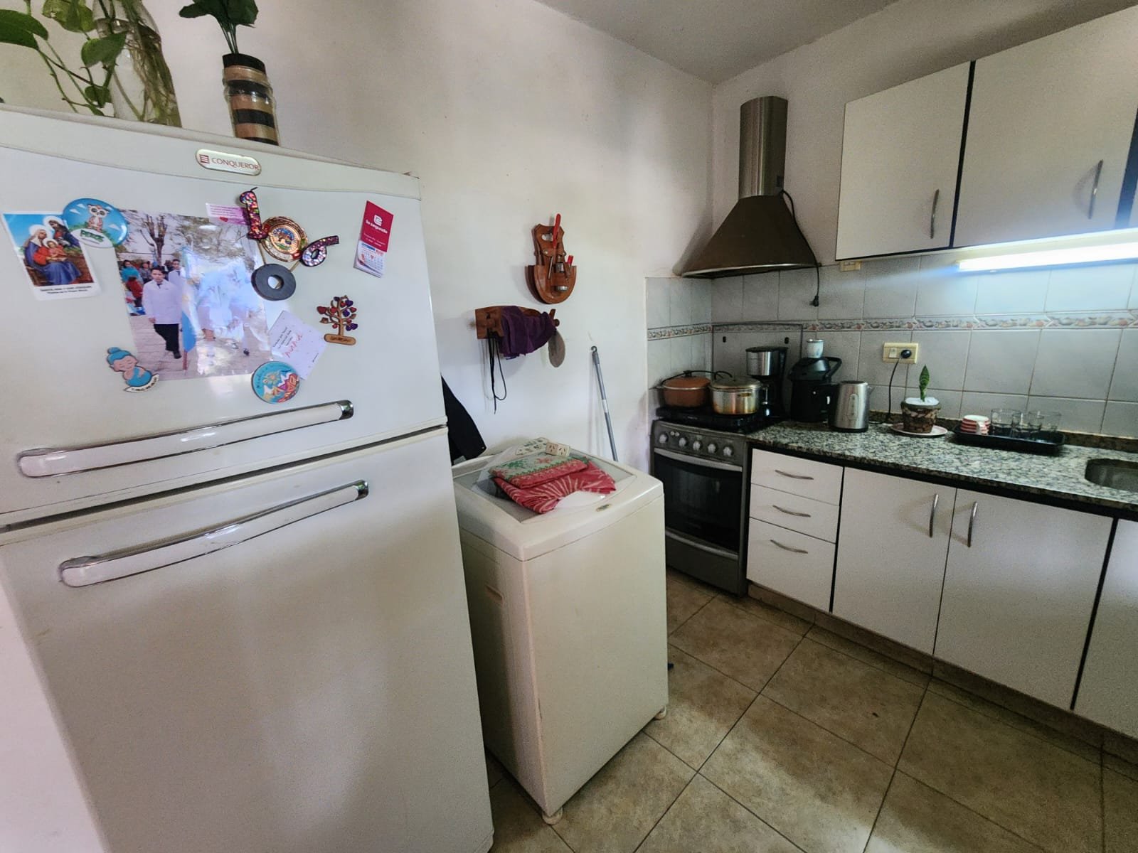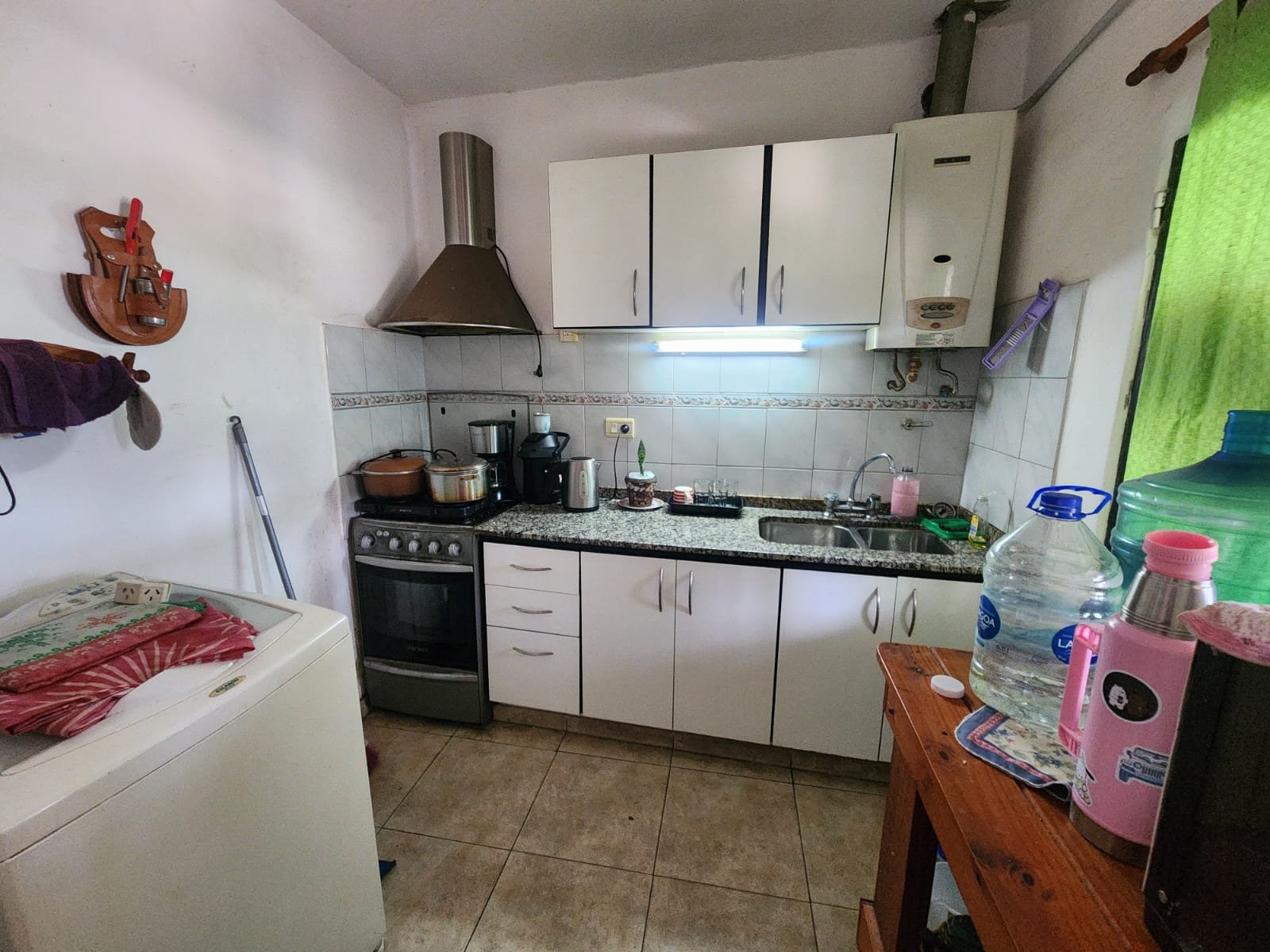 1 Cocina comedor integrada con ingreso desde la cochera y salida al patio trasero por medio de una puerta ventana. La cocina se compone de alacenas y bajomesada de melamina blanca, mesada de mármol granito con doble bacha de acero inoxidable, calefón, extractor de humo, conexión para lavarropas y la pared revestida con cerámicos.
