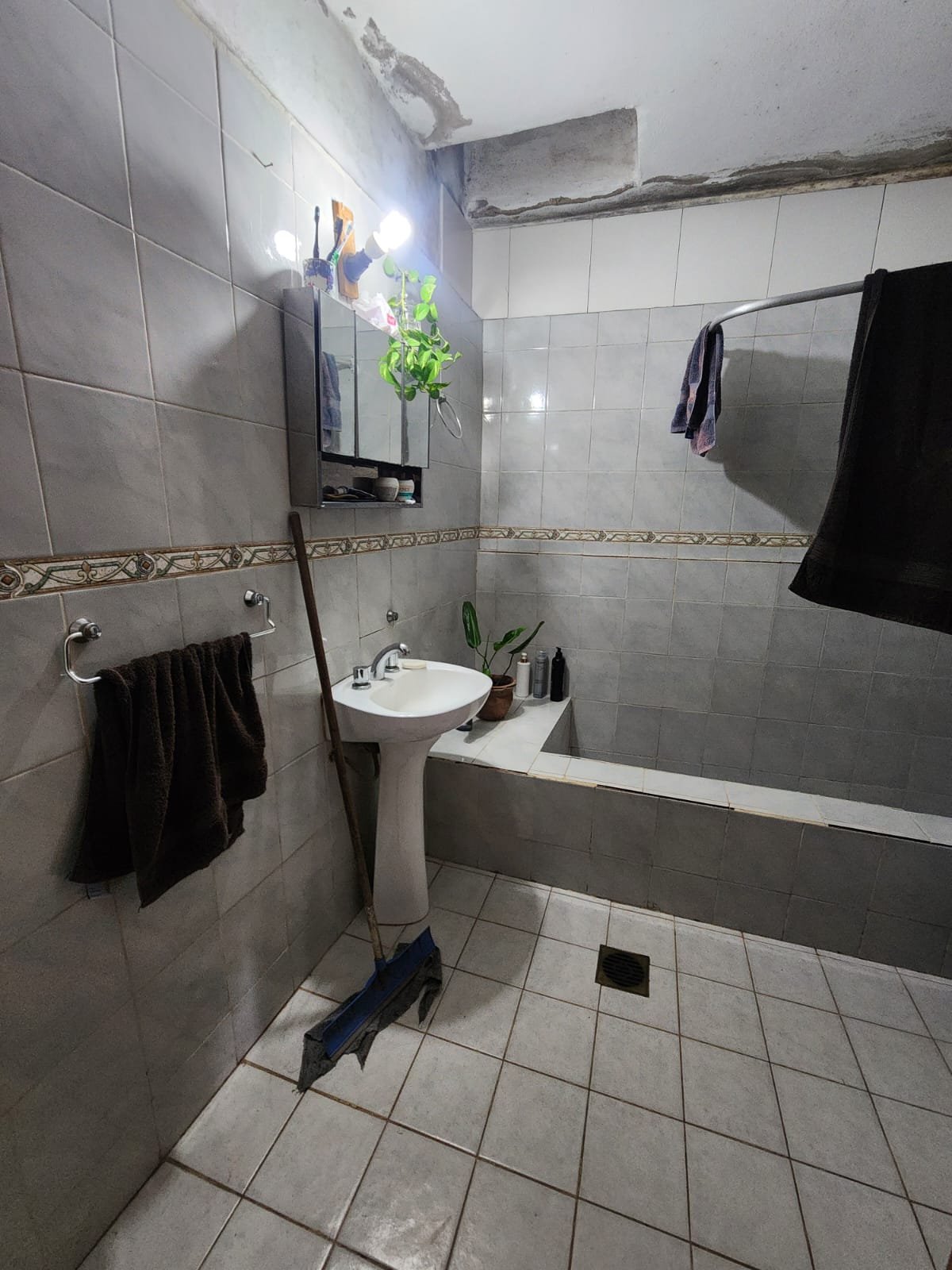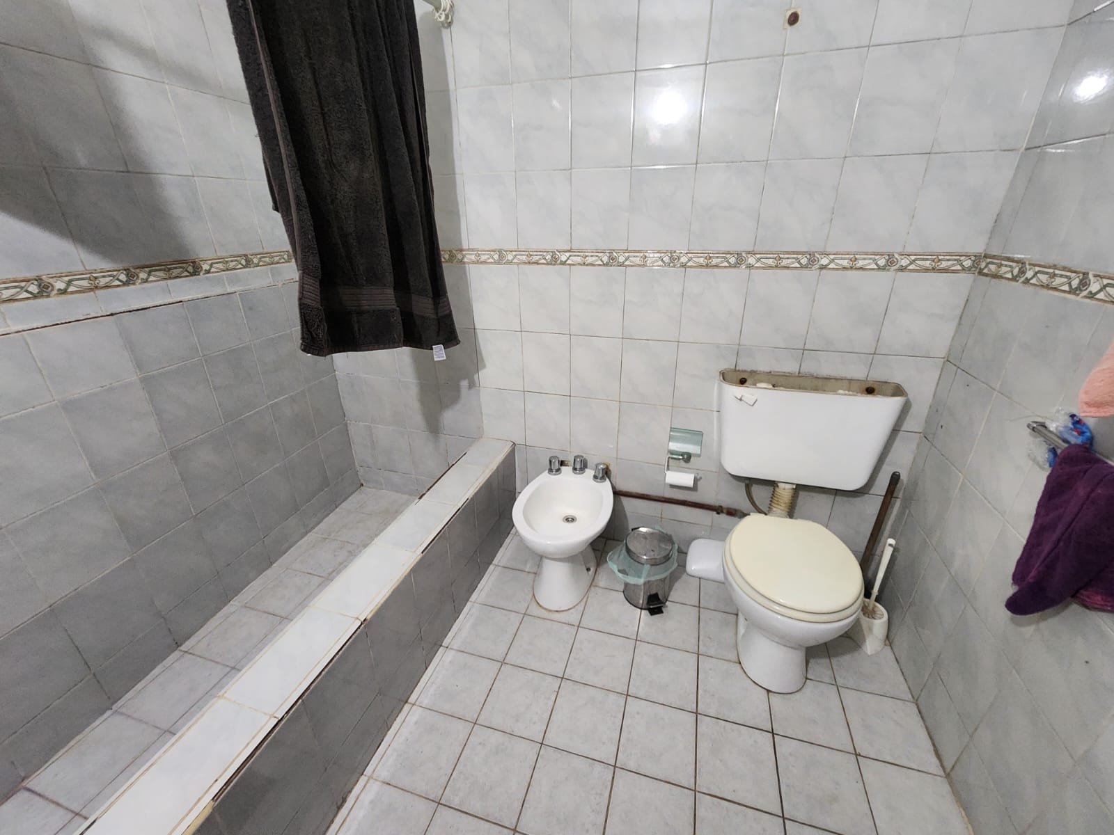 1 Baño grande completo con todos sus accesorios y la pared revestida con cerámicos.