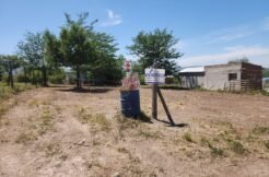 El perímetro está delimitado con postes de madera y alambre de hilo en el frente, postes de cemento y alambre romboidal en el costado derecho y fondo.