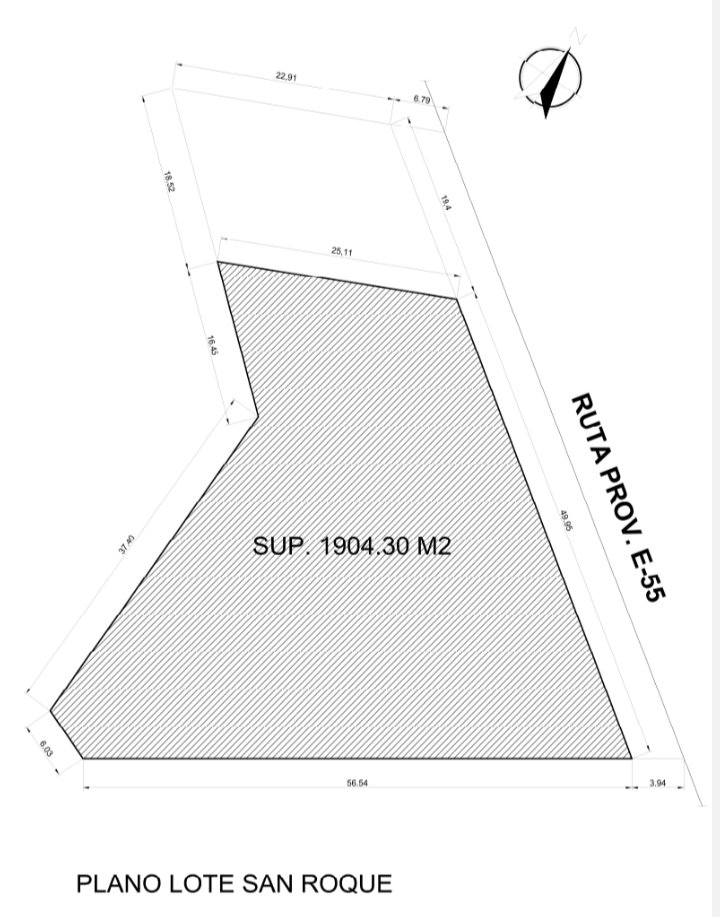 El inmueble tiene 1.904,30m2 de superficie total con 49,95 metros de frente sobre ruta E-55 y sus costados de forma irregular.