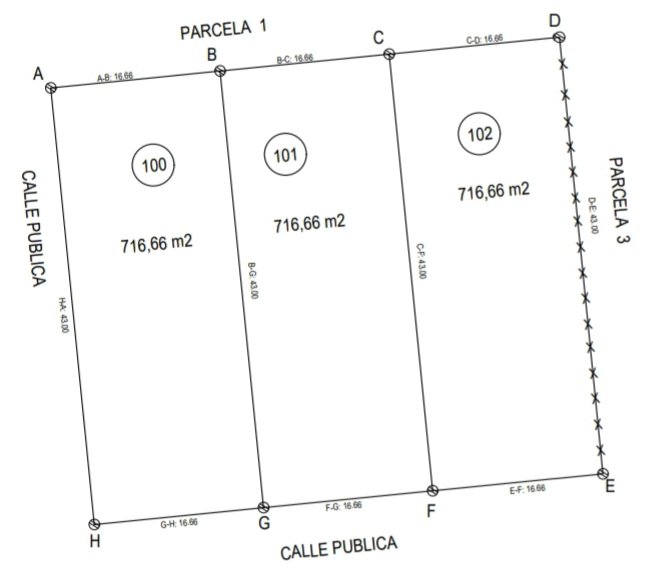 El lote 102 es medial y tiene 716,66m2 de superficie total (16,66 metros de frente x 43,00 metros de fondo). El valor del mismo es USD $21.000 dólares.