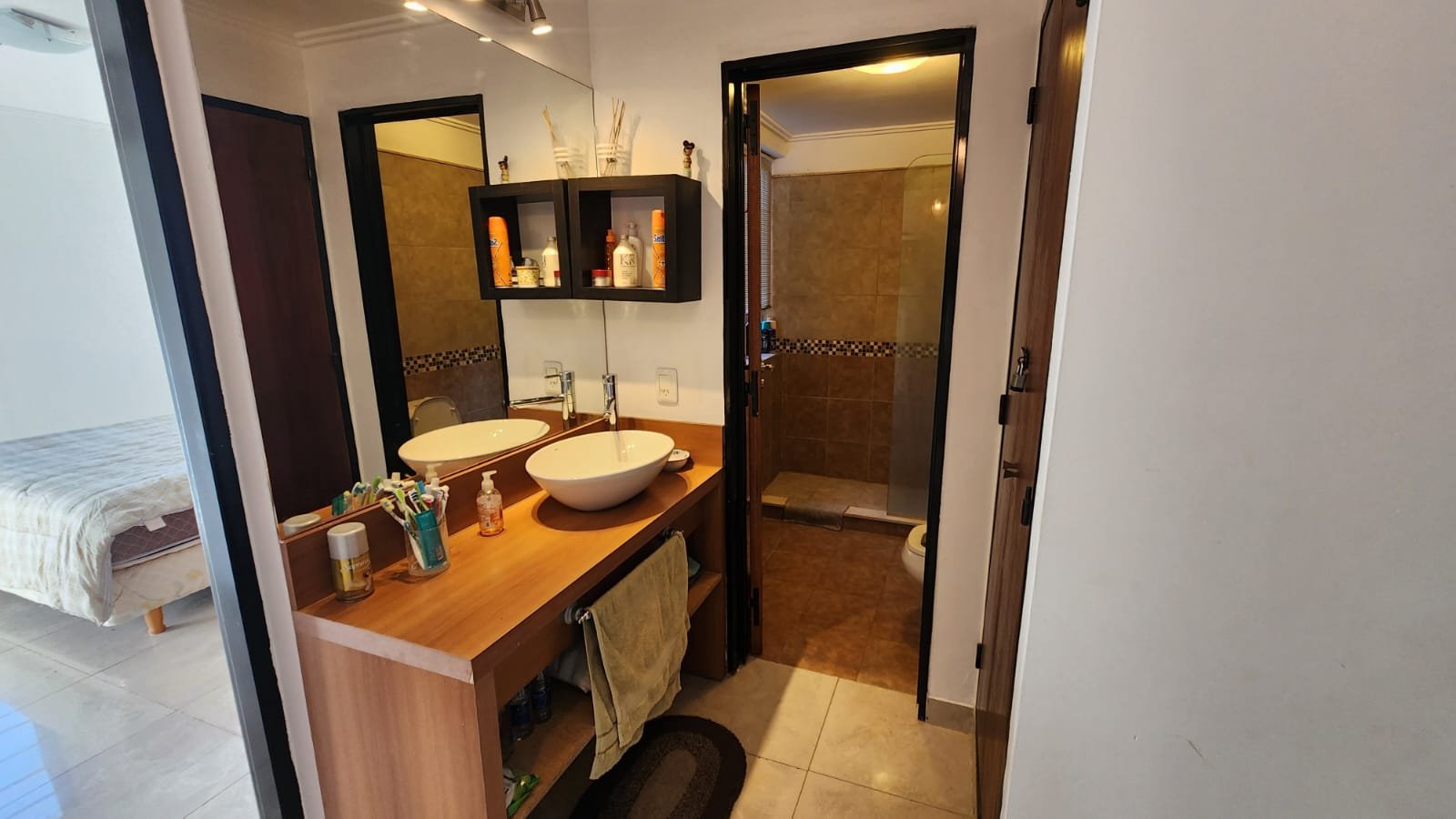 1 Baño sectorizado de estilo moderno completo con todos sus accesorios con ante baño. En el sector de la ducha tiene mampara de vidrio y la pared revestida con detalle de venecitas.