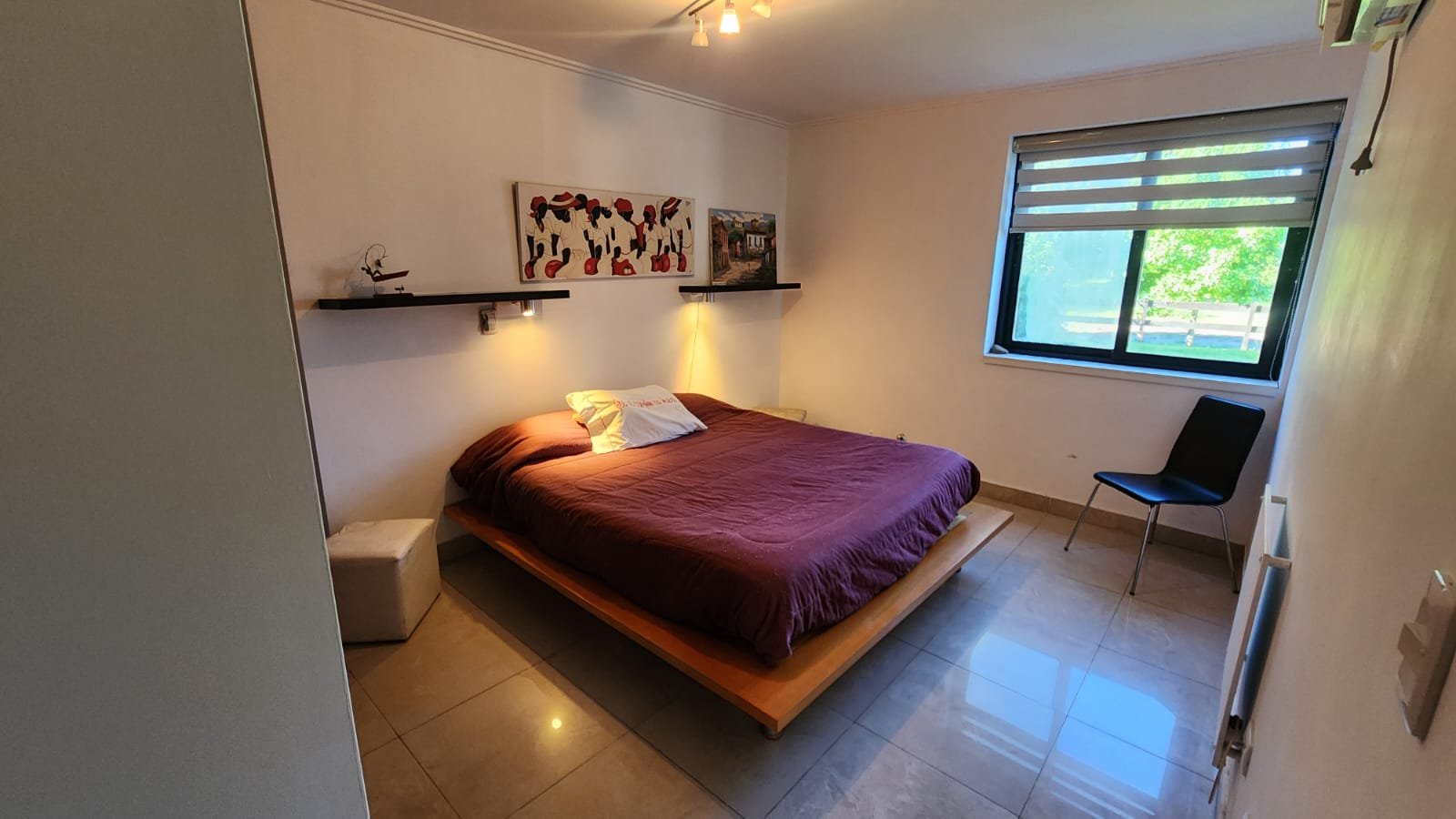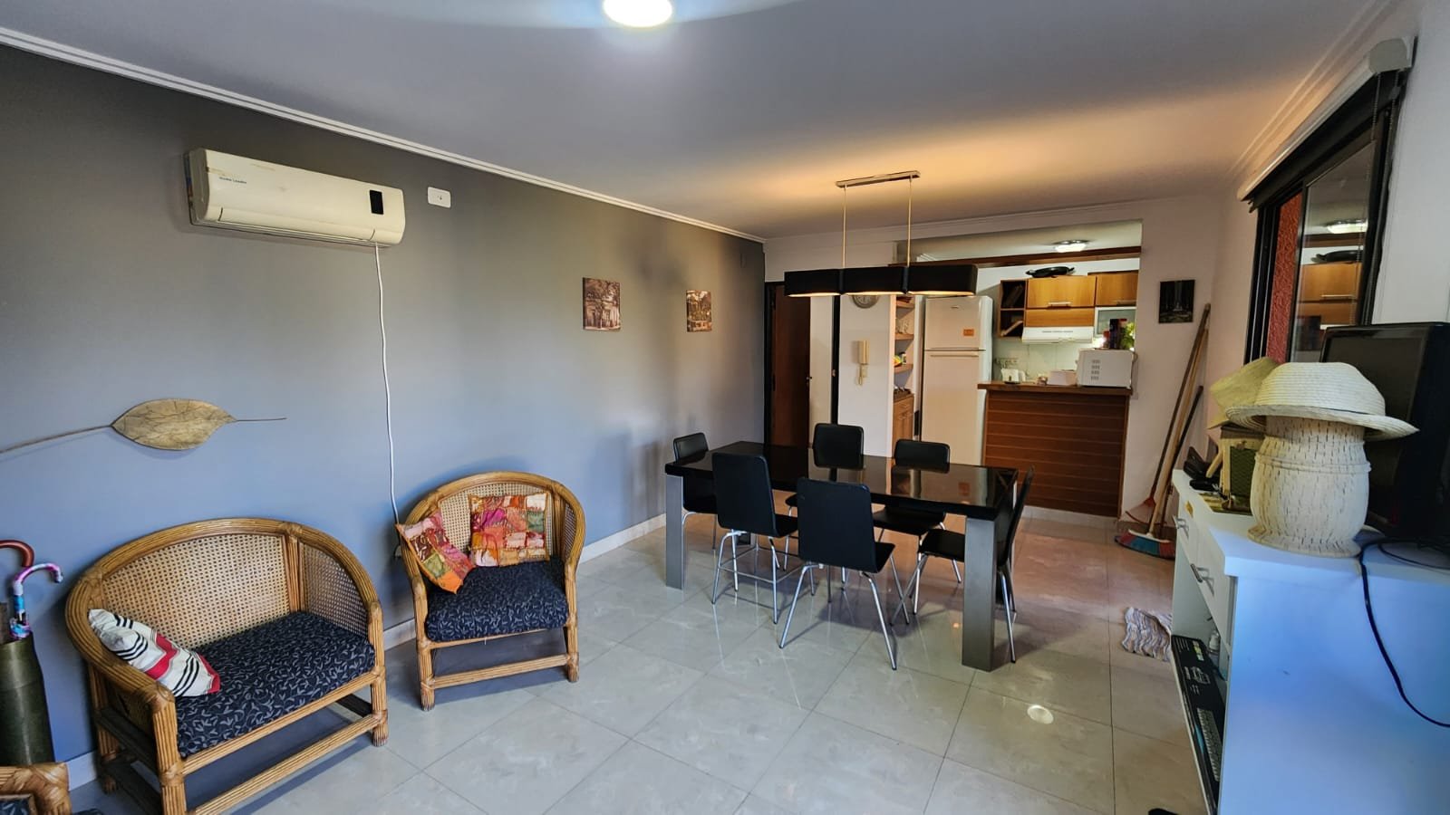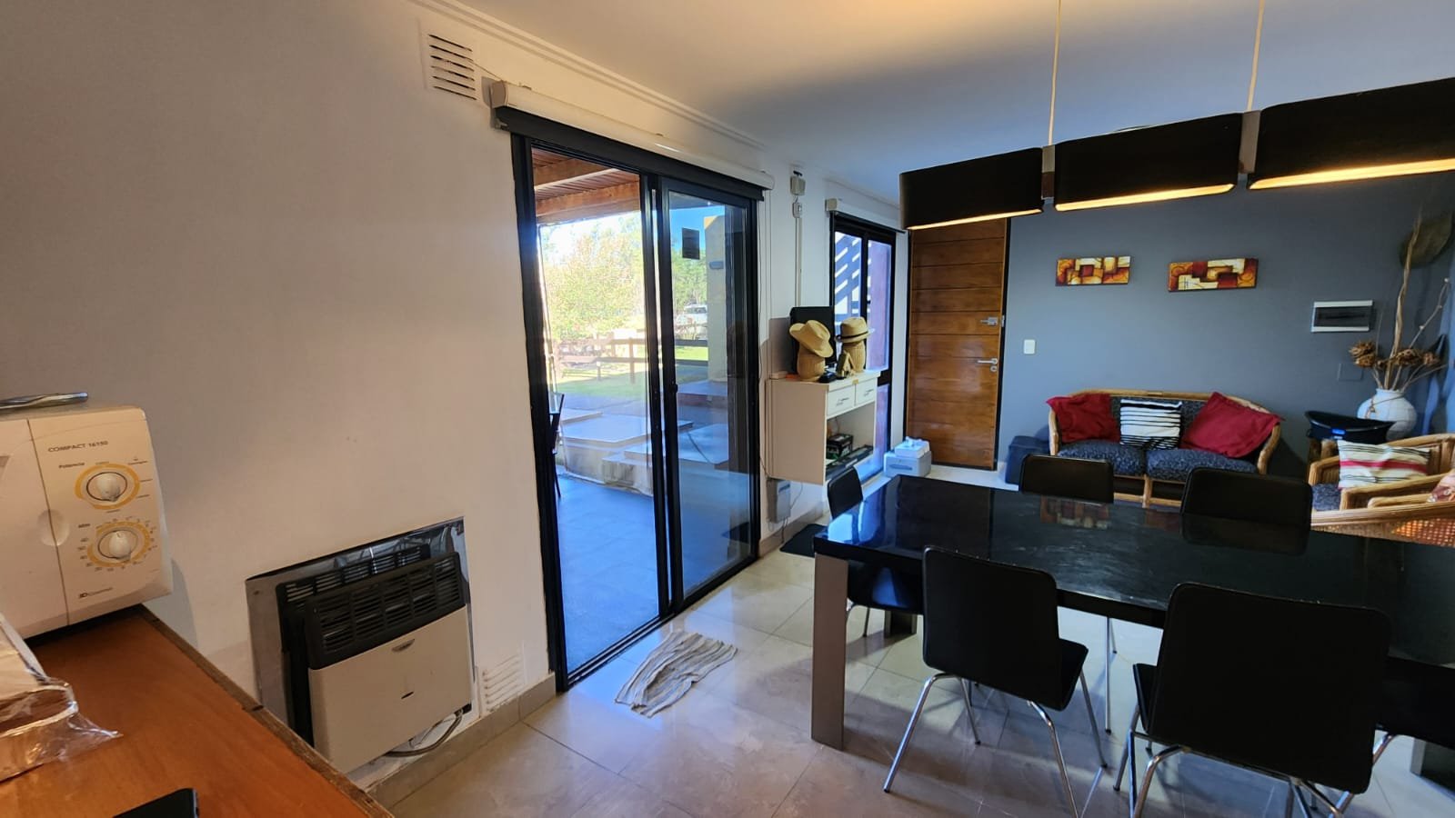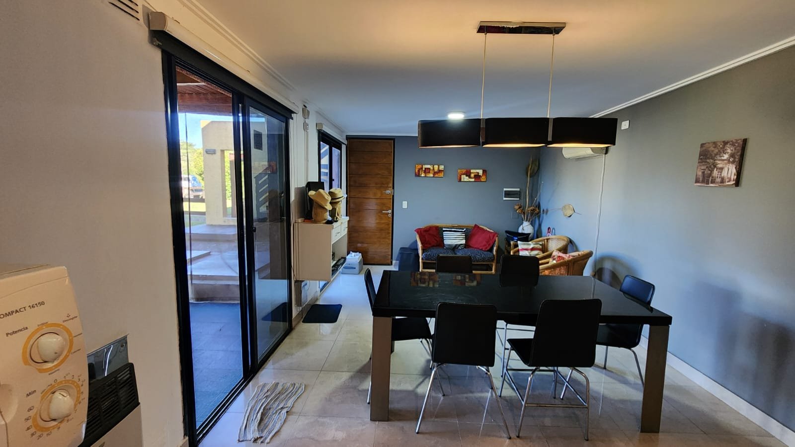 1 Living comedor amplio con muy buena ventilación. El espacio tiene acceso desde la puerta principal y dos puertas ventanas que comunican el quincho con este ambiente. Posee calefactor, aire acondicionado, luminaria moderna y buena luz natural.