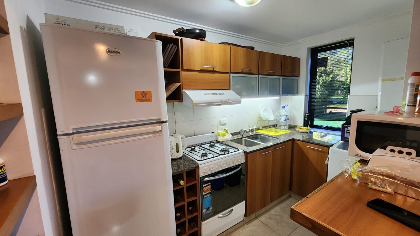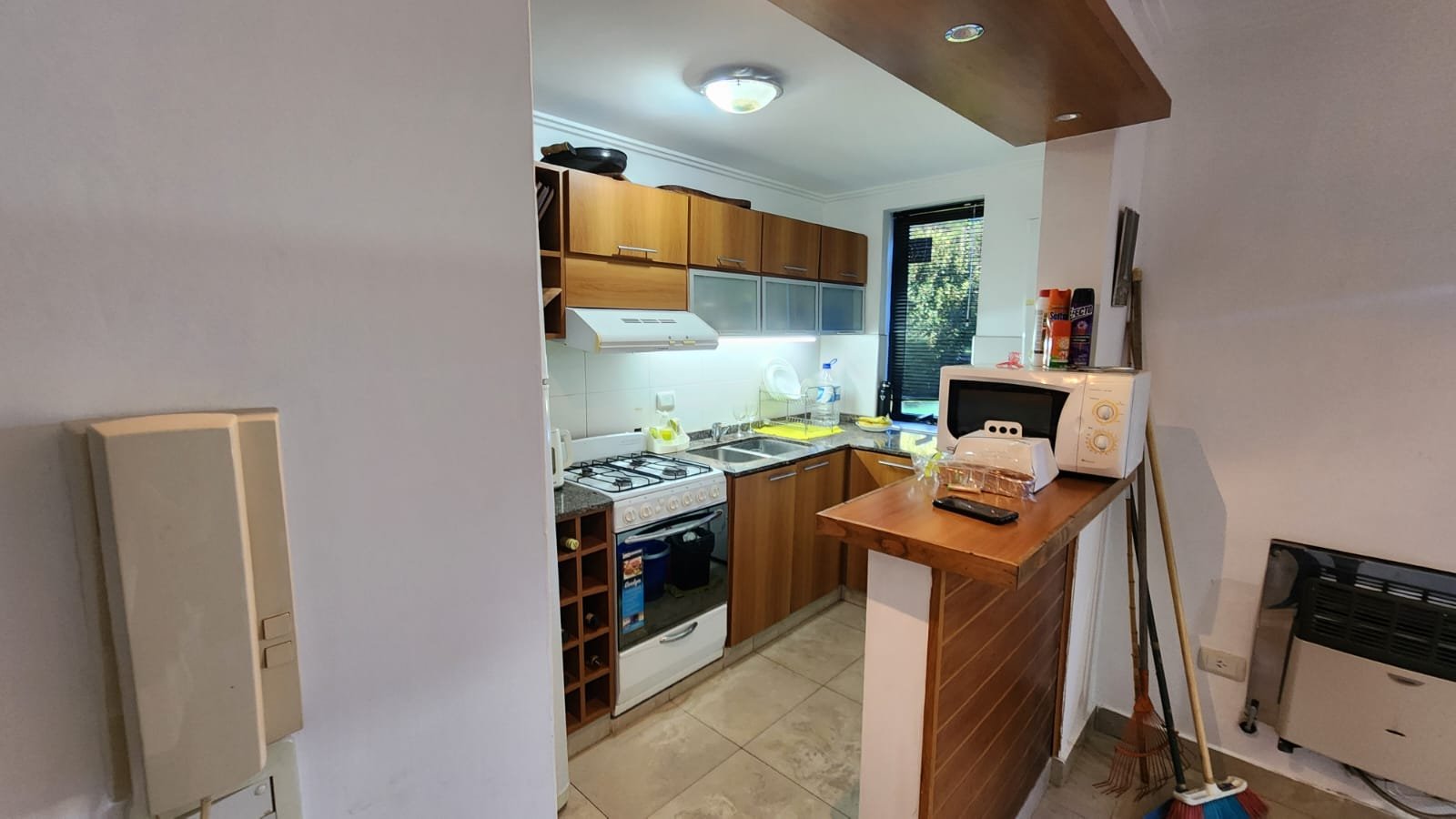 1 Cocina independiente separada del living por una barra desayunadora que combina con el resto de mobiliario del ambiente y luces led arriba. La misma se compone de alacena y bajomesada de melamina símil madera con mesada de mármol granito más doble bacha de acero inoxidable, extractor de humo, heladera y cocina para cocinar.