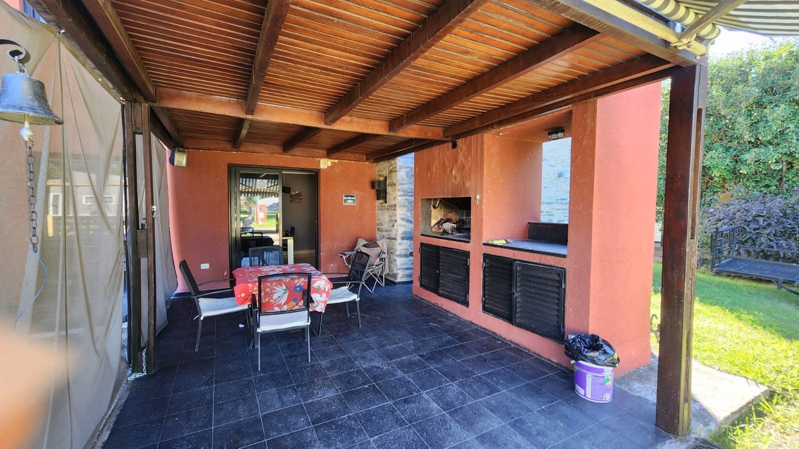 1 Cochera tipo quincho con asador grande, espacio para guardar cosas abajo y mesada. Este lugar tiene capacidad para guardar un vehículo grande y un toldo extensible en el frente.